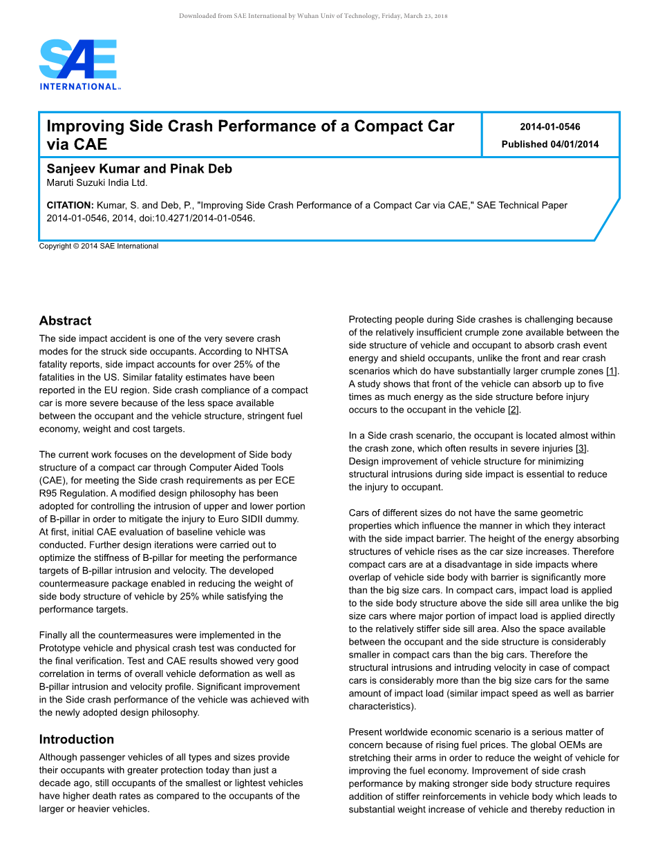 目前的工作重点是通过计算机辅助工具(CAE)开发紧凑型轿车的侧车身结构,以满足ECE R95规定的侧撞要求。 采用修改后的设计理念来控制B柱上下部分的侵入,以减轻对欧洲SIDII假人的伤害。 首先,进行基线车辆的初始CAE评估。 为了满足B柱入侵和速度的性能指标,进行了进一步的设计迭代以优化B柱的刚度。 开发的对策套件能够在满足性能指标的同时将车身侧部结构的重量减轻25%。