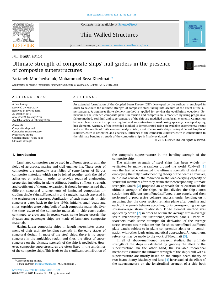 Very few publications can be found in the literature addressing the issue of ultimate strength of composite ships. Chen et al. [6]were the first who tried to estimate the ultimate strength of composite ships. They proposed a simple analytical method for calculating the ultimate strength of composite vessels. In their method, the behaviour of composite panels was formulated with a simple formula. Chen and Soares [7] extended the above-mentioned method for calculating the ultimate strength of composite ships under bending moment. Two types of the failure modes were considered in their study; the panel buckling as well as fracture of the composite materials. Later, Chen and Soares [8]estimated the reliability of composite ships under bending moment, using the first method proposed by Chen et al. [6]. To calculate the reliability of the reinforced plate buckling failure, the failure of the first layer of the reinforcing plate and the ultimate failure of the reinforced plate were considered. Finally, Chen and Soares [9] used Smith#39;s method, which is a conventiona