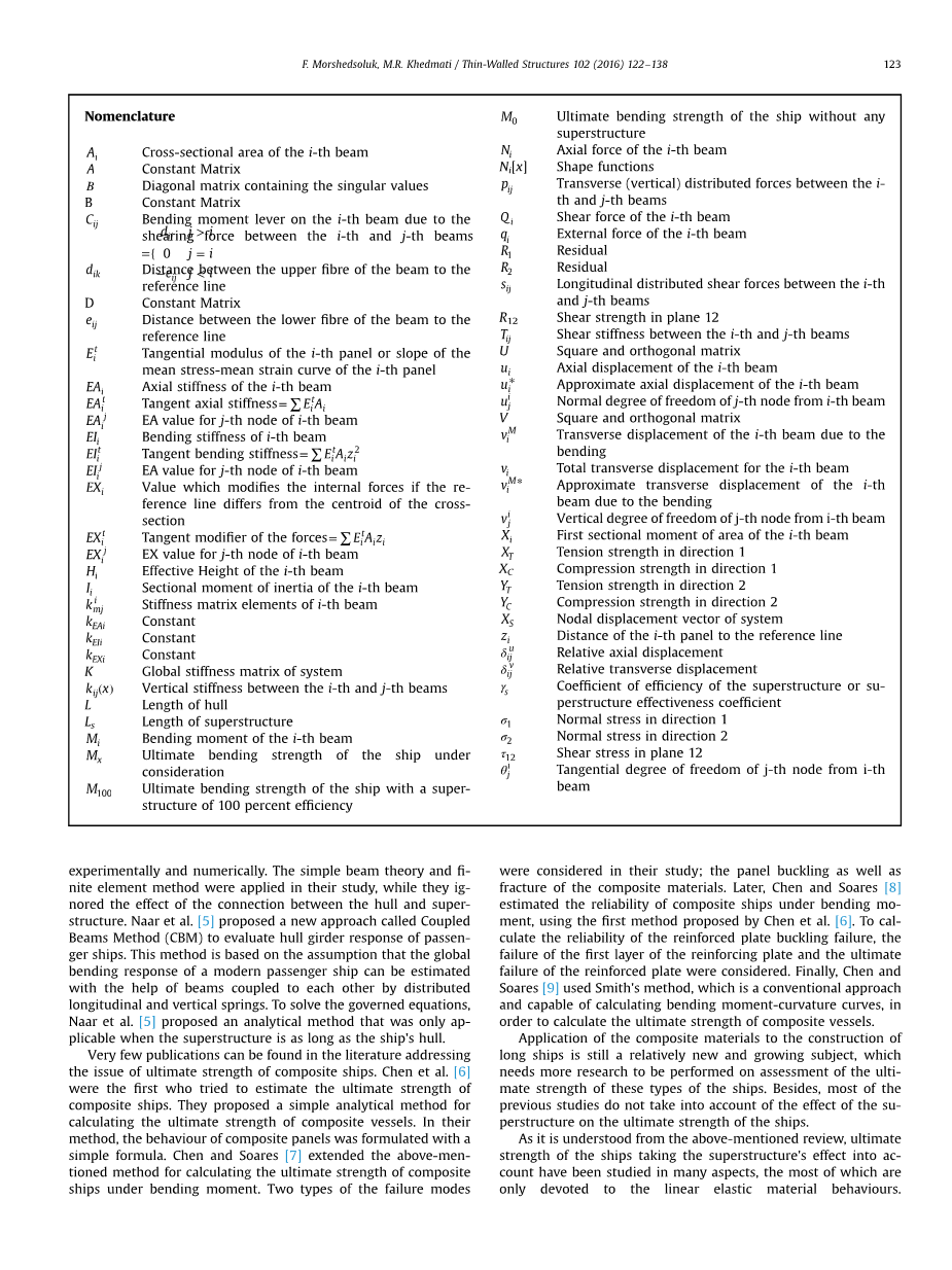 In all of above-mentioned research studies, the ultimate strength of the ships is calculated by ignoring the effect of the superstructure. On the other hand, the available theoretical methods to estimate the ultimate strength of the ship#39;s hull with a superstructure are mostly based on the simple beam theory or two-beam theory. Mackney and Rose have studied the effect of the superstructure on the longitudinal strength of a ship both experimentally and numerically. The simple beam theory and finite element method were applied in their study, while they ignored the effect of the connection between the hull and superstructure. Naar et al. proposed a new approach called Coupled Beams Method (CBM) to evaluate hull girder response of passenger ships. This method is based on the assumption that the global bending response of a modern passenger ship can be estimated with the help of beams coupled to each other by distributed longitudinal and vertical springs. To solve the governed equations,Naar et al. proposed an analytical method that was only applicable when the superstructure is as long as the ship#39;s hull.