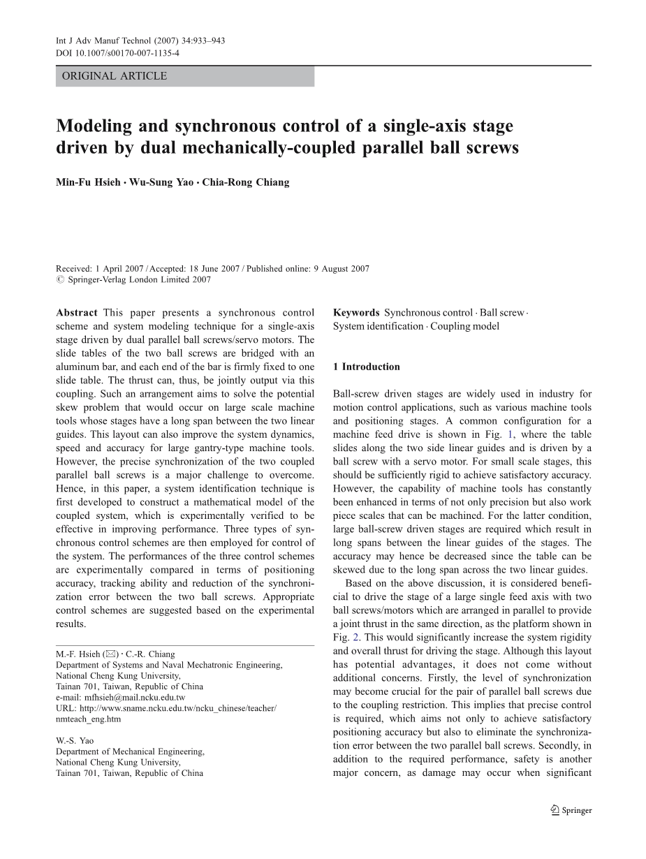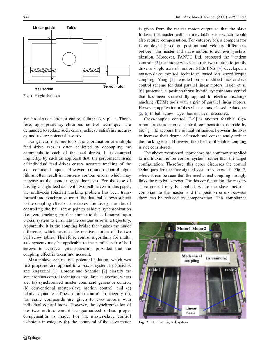 这篇论文将作如下安排。在2部分,对研究的系统进行了描述,并推导出平行滚珠丝杠系统的数学模型。第三部分讨论同步控制方案的设计。实验研究将在4部分呈现,之后的5部分将对论文进行简要的总结。