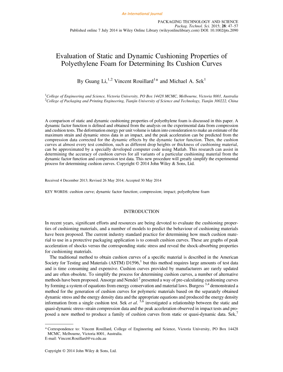 本文讨论了聚乙烯泡沫的静态和动态缓冲性能的比较。一个动态的因素函数的定义和获得的压缩和缓冲试验的实验数据的分析。考虑到单位体积的变形能,对冲击过程中的最大应变和动应力数据进行估计,并利用动态因子函数对动态效应修正后的压缩数据进行峰值加速度预测。然后,在几乎所有的测试条件的缓冲特性曲线,如不同的跌落高度或厚度的衬垫材料,可以通过一个专门开发的计算机代码使用matlab近似。这项研究可以帮助确定缓冲曲线所有变体的一个特定的缓冲材料的动态因素函数和压缩试验数据的准确性。这个新的程序将大大简化实验过程,以确定缓冲曲线。