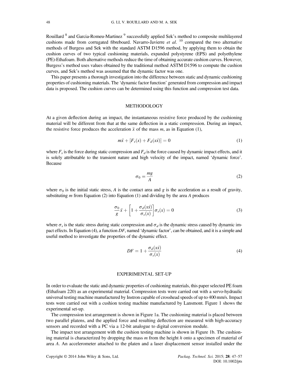 R ouillard加西亚-马丁内斯-和 罗米欧-加西亚-马丁内兹 成功的应用自制复合复合多层垫由瓦楞纸板。纳瓦罗- javierre等人,比较两个备选标准方法ASTM d1596伯吉斯和Sek方法,利用他们获得的两种典型的缓冲材料的缓冲特性曲线,发泡聚苯乙烯(EPS)和聚乙烯(PE)。这两种替代方法减少获得精确的缓冲曲线的时间。然而,伯吉斯的方法利用传统方法ASTM d1596得到的计算值的缓冲特性曲线,和Sek的方法被认为是一个动态的因素。