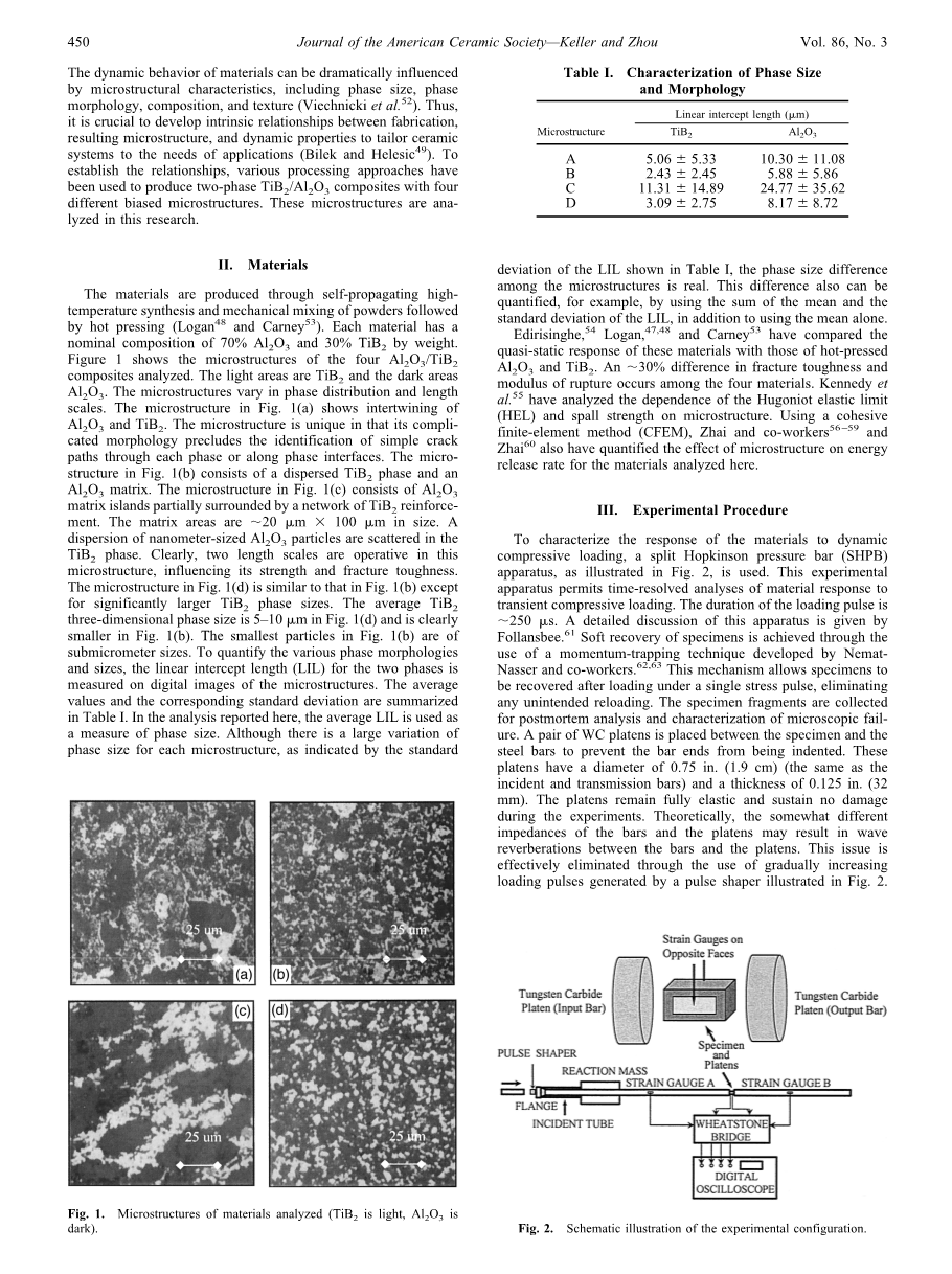 高性能陶瓷具有许多令人满意的性能,这有助于它们在以前以金属和金属合金为主的领域中得到越来越多的应用。此类应用的例子包括刀具、钻头、易损件、结构和电子部件、电极、生物力学装置、轻型装甲和燃气轮机部件等。陶瓷因其在高温下的优异机械性能、高强度、优异的化学稳定性以及抗蠕变、磨损、氧化和冲击性而非常适合于此类应用。然而除了具有良好的性能外,陶瓷还具有脆性的特点,这可能导致突然和十分严重的失效。据报道,相变增韧和强化是提高断裂韧性的两种途径。为了表征和提高陶瓷的抗破坏性能,人们进行了广泛的研究,包括Lankford、Brockenbrough等人、Longy和Cagnoux、Kishi等人、CurTin、Shockey等人、Suresh等人、Yang和Kobayashi、Evans、Kishi、Kobayashi、Espinosa和Barr、Vekinis等人、Lankford、Woodward等人, Ravichandran和Subhash,Chen和Ravichandran, Bhattacharya等人和Subhash和Ravichandran.科学家们提出了一些连续损伤理论的模型,其中断裂的净效应被理想化为弹性模量的退化,例如Seaman等人 ,Curran和同事Rajendran, Johnson和Holmquist以及Espinosa和Barr。Rose的早期工作着重于裂纹尺寸和微裂纹对断裂韧性的影响。Budiansky和同事们分析了纤维增强和颗粒增强陶瓷复合材料的强度和韧性。Marshall和同事们分析了微观结构强化效应和失效机理。KrsTic研究了晶粒尺寸对脆性材料断裂强度的影响。Evans和Evans及其同事们对陶瓷复合材料的微观结构增韧和界面效应进行了广泛的分析。CurTin对纤维陶瓷复合材料的强度和变形进行了实验和分析研究。Sun等人研究了Si3N4的晶粒形状和尺寸对断裂韧性的影响。Lawn等人提出了准静态和循环条件下的失效和微观结构效应研究。Wiederhorn等人提供了高温下陶瓷变形和可靠性的系统表征。微结构效应对材料性能有重要影响。Niihara等人报告说,5%的SiC纳米颗粒将Si3N4的拉伸强度从350MPa提高到1GPa,断裂韧性从3.25MPa*m1/2提高到4.7MPa*m1/2。Becher已经证明,裂纹桥联增韧过程可以与其他桥联机制和其他增韧机制相结合,以实现协同效应。微观和纳米级的微观组织诱导、尺寸依赖的增韧机制是性能提高的途径。为了开发更先进的材料,有必要研究相形态、相长尺度和界面行为对断裂韧性的影响。近年来,TiB2/Al2O3两相陶瓷的相尺寸和相形态都有了很大的变化,这些材料表现出了很宽的断裂韧度范围,其中一些断裂韧度值高于两种组分分别批量生产的断裂韧度值。这些材料为研究微观结构与力学行为之间的关系提供了可能。在许多工作中,在正常条件下会发生强烈的动态负载,这包括对陶瓷涡轮叶片的颗粒冲击、高速切削刀具与工件的接触以及弹道弹丸与陶瓷装甲的冲击。材料的动态行为会受到微观结构特征的显著影响,包括相尺寸、相形态、成分和结构。因此,在制备、产生的微观结构和动态性能之间建立内在关系,以便根据应用的需要定制陶瓷系统是至关重要的。为了建立这种关系,人们采用不同的加工方法制备了具有四种不同偏压结构的TiB2/Al2O3两相复合材料,本文分析了这些微结构。