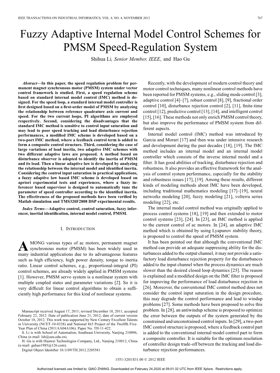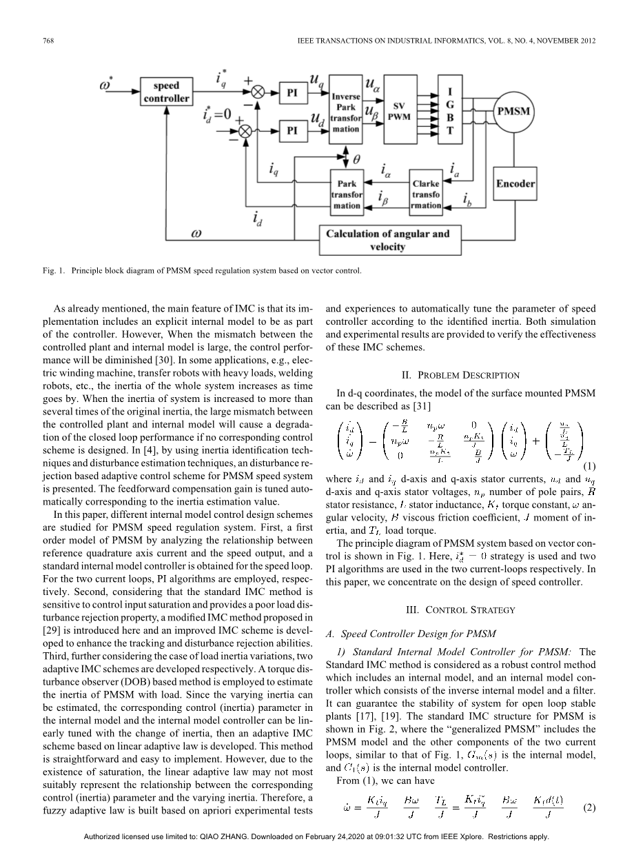 关键词-自适应控制,控制饱和,模糊推理器,惯性识别,内部模型控制,PMSM。