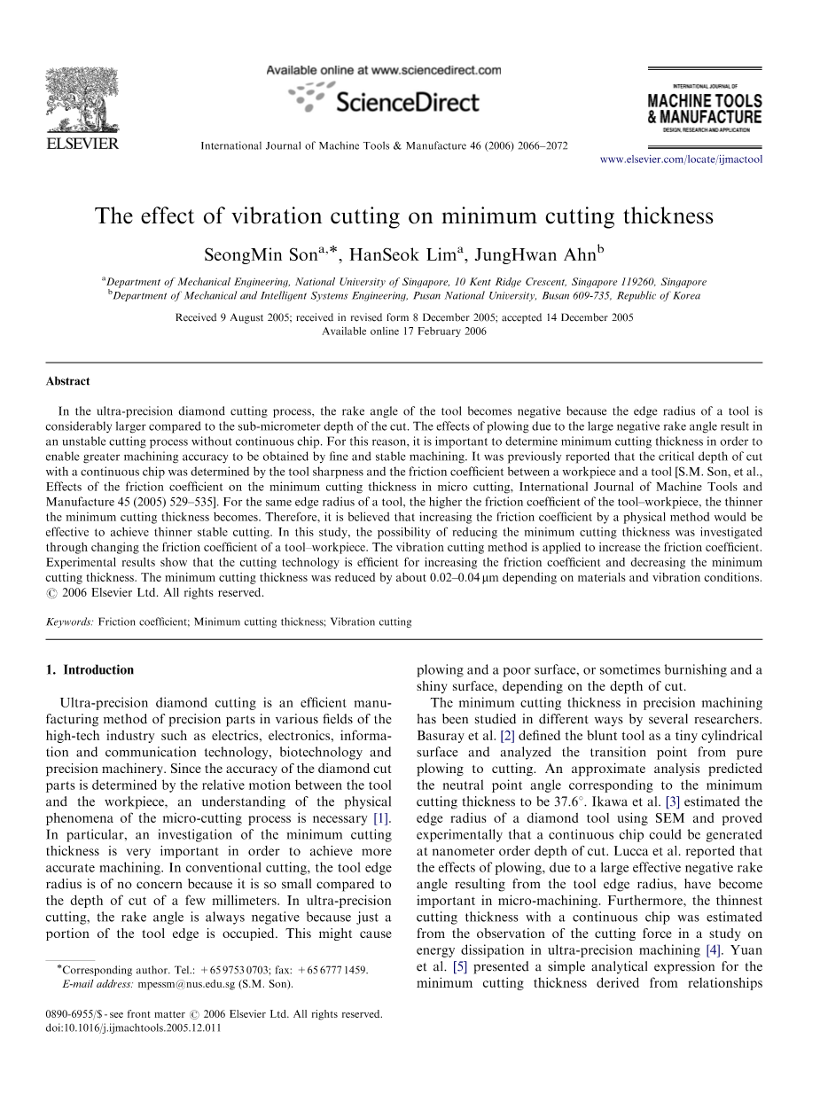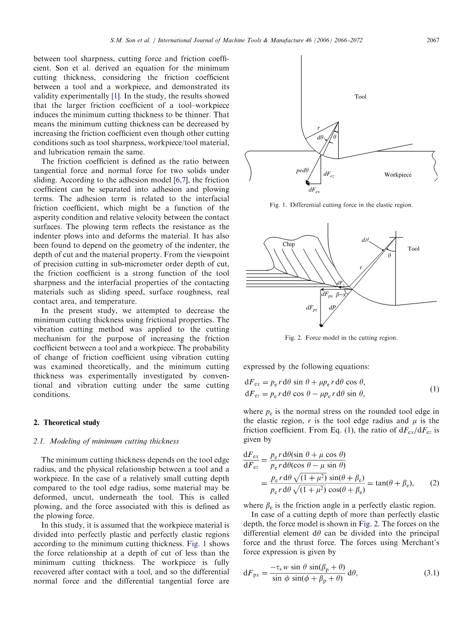 几位研究人员以不同的方式对精密加工中的最小切削厚度进行研究。Basuray以及其他人[2]将钝工具定义为微小圆柱面,分析了从爬行到切削的过渡点。预测的近似分析中性点角对应最小切割厚度为37.61。Ikawa等人[3]利用扫描电镜对金刚石刀具的刃口半径进行了估算,并通过实验证明了在纳米级切削深度下可以产生连续的切屑。Lucca等人报告说,由于刀刃半径导致的大的有效负前角,刨削的影响在微加工中变得重要。此外,在超精密加工的能量耗散研究中,从切削力的观察来估计具有连续切屑的最薄切削厚度[4]。Yuan等人[5]提出了一个简单的解释表达式的最小切削厚度推导工具锐度,切削力和摩擦系数之间的关系。Son等人推导出最小厚度的方程,考虑工具和工件之间的摩擦系数,并通过实验证明其有效性[1]。在研究中,结果表明,工具工件的较大的摩擦系数导致最小切割厚度更薄。这意味着通过增加摩擦系数可以减小最小切割厚度,即使其他切割条件,例如工具锐度,工件/工具材料和润滑保持不变。