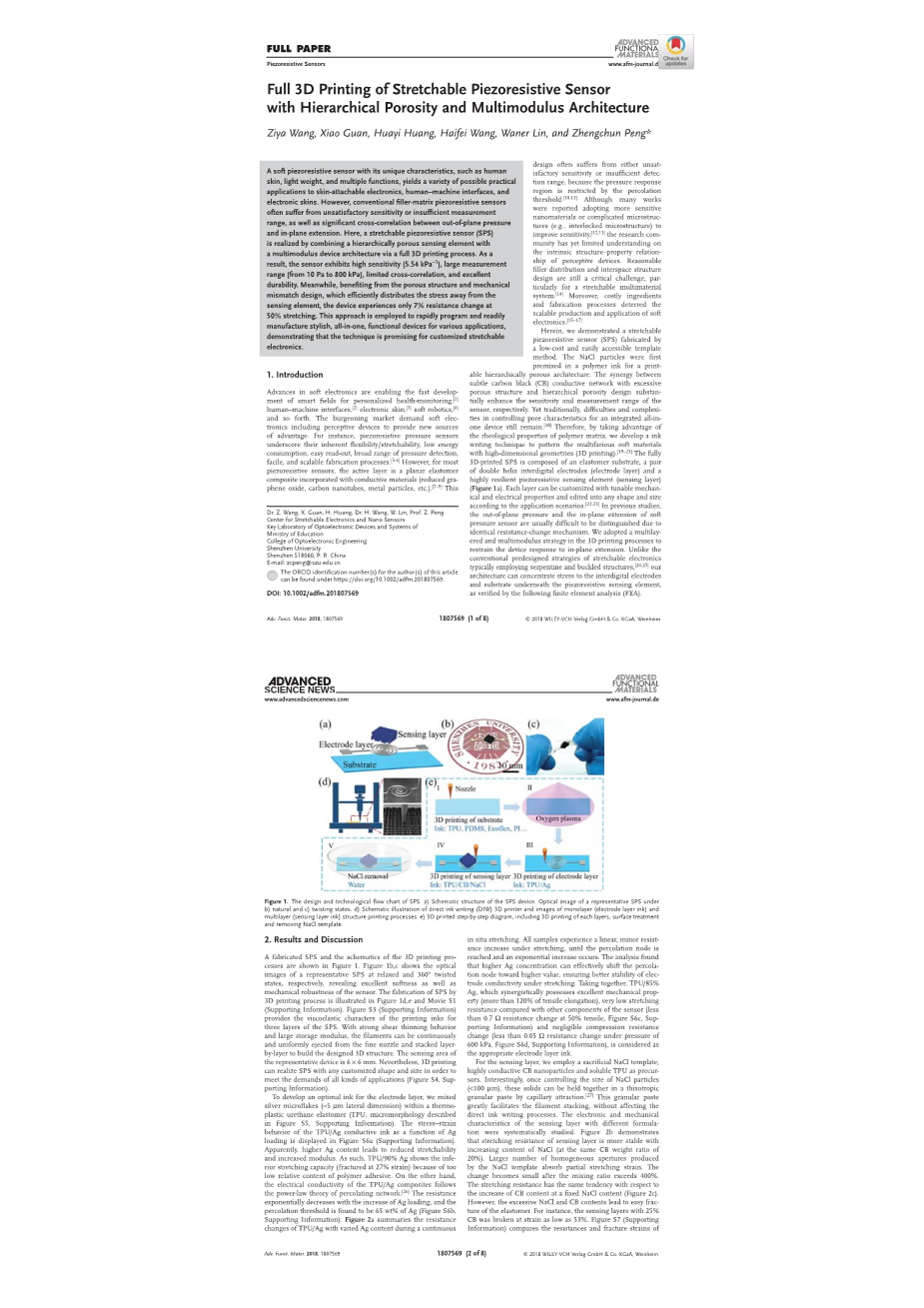 摘要:具有高延展性的透明导体是可穿戴传感器和电子产品的理想选择。但是现有的传感器的在受到变形作用时电阻显著增加,并且器件的制作工艺繁琐复杂。我们利用基于光聚合的3D打印技术构建了离子导电水凝胶,然后将透明、高拉伸性、弹性的水凝胶开发成电容传感器,可以同时感知压力和应变。离子导体的3D打印技术为微结构电极的制备提供了一种有效、灵活的方法,极大地简化了器件的制备过程,同时使器件具有较高的灵敏度和较低的检测限制。其特点是通过利用高保真的信号采集在多个皮肤位置的关键信息,从而为开发新型智能电子和人工智能设备提供了较大的借鉴意义。