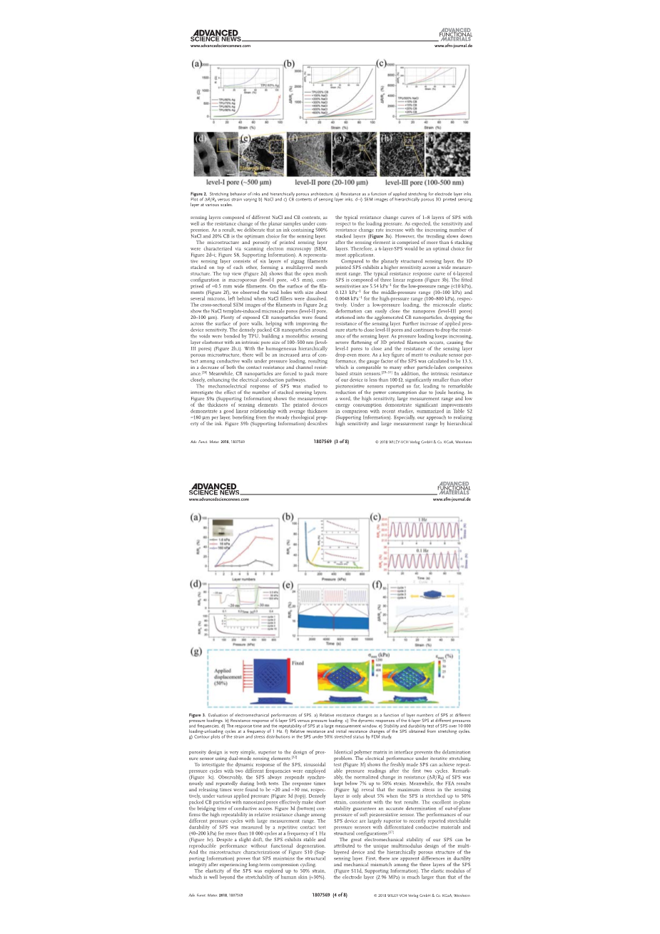 图1a中的图像显示了打印的PAAm-PEGDA水凝胶的三维蝴蝶、海星、章鱼。这些样品表面光滑,没有明显的人工界面。这些实例的打印时间是不同的,这取决于模型的高度和层厚。例如,需要5.2分钟才能打印一个3.5毫米高度蝴蝶,而差不多需要20分钟才可以打印一个13毫米高度与一层厚度一致的25mu;m章鱼。毫无疑问,通过适当增加层厚可以缩短整体的建造时间,而每一层的相应照射时间应该稍微延长[55]。在实验中,我们使用一层厚度25mu;m 2.2 s辐射的照射对每个层固化。从图1b可以看出,PAAm-PEGDA水凝胶膜是由不同的微观结构拼贴而成的,包括蜂窝状、线状、雪花状、点阵列等,这些结构电极在可穿戴设备中具有潜在的应用前景。这些3d打印的成品分辨率可以高达150mu;m。打印的PAAm-PEGDA水凝胶几乎是光学透明的; 1 mm厚的PAAm-PEGDA打印水凝胶在可见区域的平均透光率94.3%(补充图1),略低于直接铸型水凝胶(98.9%)。这是由于油墨与样品在印刷过程中反复的相对运动,但其仍能满足高透明装置的要求。同样,水凝胶具有高度的可拉伸性和弹性,能够承受高水平的压缩变形和不均匀拉伸,以及打结和扭曲拉伸,没有任何可见的损伤(图2)。这一特性可扩展可拉伸电子元件在极端变形条件下的潜在应用[56,57]。从图1d可以看出,PAAm-PEGDA水凝胶可以被拉伸至其初始长度的5.7倍,同时不影响其透明度。即使在拉伸状态下(约2倍),仍然可以作为点亮3v LED灯泡的导电路径直流电源。 结果表明,由于在印刷过程中,大量的盐水(约74 wt%)被截留在水凝胶的自由网络空间中,所以印刷后的共水凝胶具有良好的导电性。此外,鉴于以下两个事实(1)电容式的传感器不需要极低的电极电阻(~ 300Omega;sq-1),(2)当水凝胶电极组装成一个电容式感应设备, 过多的水分会降低电介质层与水凝胶电极之间的粘结力,给加载时的测量结果带来不利的界面位移和不可预测的误差,我们决定直接使用打印好的预擦拭的微结构水凝胶薄膜作为电极,将其组装成离子皮肤。以下结果均来自于印刷后的PAAm-PEGDA水凝胶,没有后续的膨胀[58-60]。