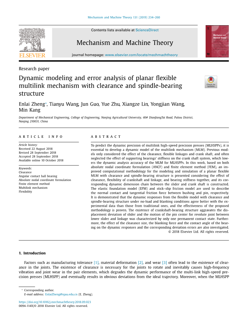 1.介绍:制造公差[1]、材料变形[2]、磨损[3]等因素往往导致接头存在间隙。间隙的存在是关节旋转的必要条件,必然导致副件高频振动和关节磨损,降低了多连杆高速精密压力机的动态性能,最终导致理想轨迹明显偏离。