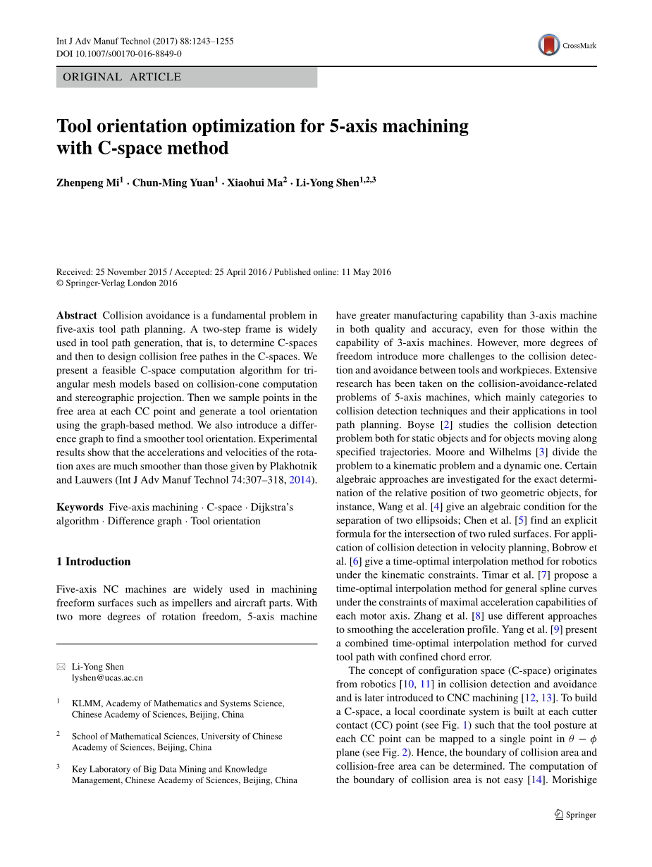 配置空间(C-space)的概念源自碰撞检测和回避中的机器人[10,11],并且后来被引入到CNC加工[12,13]。为了构建C空间,在每个刀具接触(CC)点(见图1)建立局部坐标系,使得每个CC点处的刀具姿势可以映射到theta;-phi;平面中的单个点 图2)。因此,可以判定碰撞区域和无碰撞区域的边界。碰撞区边界的计算是不太容易的[14]。Morishige等人引入一种算法来计算简单多面体的Cspace,通过对边界进行采样并应用二维C空间方法来生成没有碰撞的工具路径。Jun等人[17] 在C空间中引入搜索方法来最小化尖点高度并提高加工的精度。Lu等人提出了一种用于棋盘格表面加工的三维Cspace方法。Lin等人[19]提出了一种算法来生成点云的C空间的算法,然后用三次B面插值它们。[20]提出一种算法来生成点云的C空间,但重点是局部刨和后部刨。Li等人[21]提出了一系列算法,在基于刀具在零件表面上的点处的可达图(A-map)生成具有平滑刀具运动和高效率的刀具路径。可达图(A-map)和以两个旋转角度作为坐标轴的C空间相似。为了生成非奇异的工具路径,林等人[22]将A-jump和C-jump转换为C空间,然后采用锥形圆和方向折线现来检测奇点。然后,提出了一种避免奇点的算法。王等人[23]认为同时考虑气刨和角速度。[24-26]考虑了再C空间中生成刀具轨迹的不同类型。