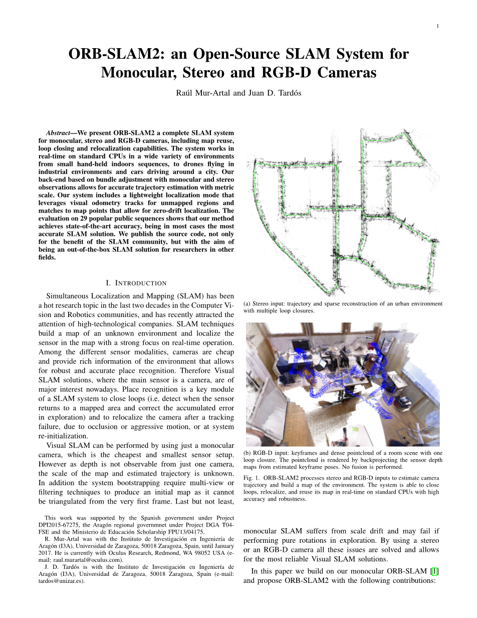 图一展示了ORB-SLAM2来自立体相机的输出和来自深度相机的输入。立体相机的例子展示了来自KITTI数据集00序列的最终轨迹和稀疏重建。这是一个城市序列,这个序列里有能被ORB-SLAM2成功探测到的多个回路差。深度相机的例子显示了来自TUM RGB-D数据集fr1_room序列的关键帧姿态估计,以及通过来自估计关键帧姿态向后投影传感器深度地图提出的一个密集点云。注意,我们的SLAM不像任何类似KinectFusion的融合物,但是好的定义显示出关键帧姿态的精确性。更多的例子在附加的视频中。