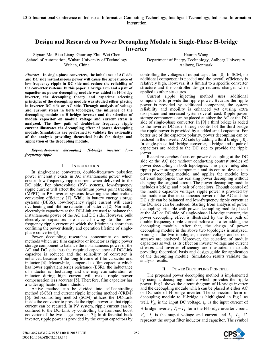 关键词 - 功率解耦; H桥逆变器; 低频波动