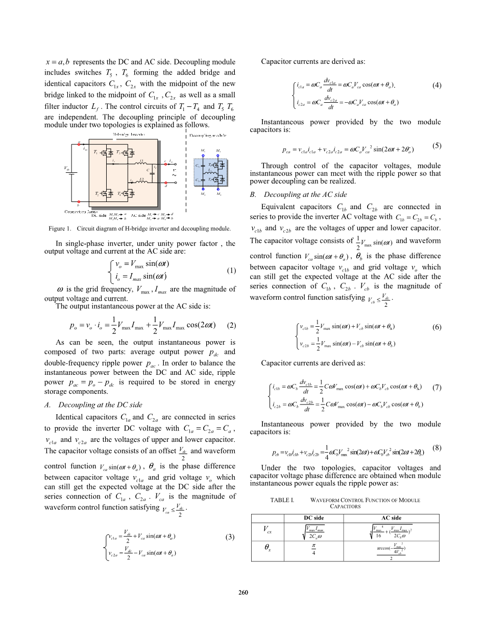 功率解耦模块在直流侧和交流侧时,满足。当时模块可以提供最大纹波功率,令脉动功率幅值为, Ceqa ,Ceqb为等效模块电容,根据表1 得到: