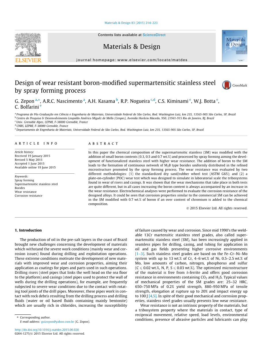 本文对超级马氏体不锈钢 (SM) 的化学成分进行了改性, 添加了硼含量 (0.3、0.5 和 0.7 wt.%), 并用喷雾成形,以对高耐磨功能性不锈钢的发展进行了研究。添加硼到超级马氏体中导致 M2B 型硼化物连续网络的形成, 均匀分布在由喷雾成型过程形成的精制显微组织中。采用两种不同的方法对耐磨性进行了评价: (1) 标准干砂/橡胶轮试验 (ASTM G65); (2)进行一个气缸板磨损试验用于模拟实验室条件下套管之间磨损的摩擦系统。结果表明, 在这两种试验中发生的磨损机制是不同的, 但在所有情况下, 增加硼含量总是伴随着增加耐磨性。对设计的合金进行了电化学分析, 以评价其耐腐蚀性能。可以看出, 如果在化学成分中添加了超过0.7wt% 的铬含量, 那么可以获得满足商用耐腐蚀性的超级马氏体不锈钢。