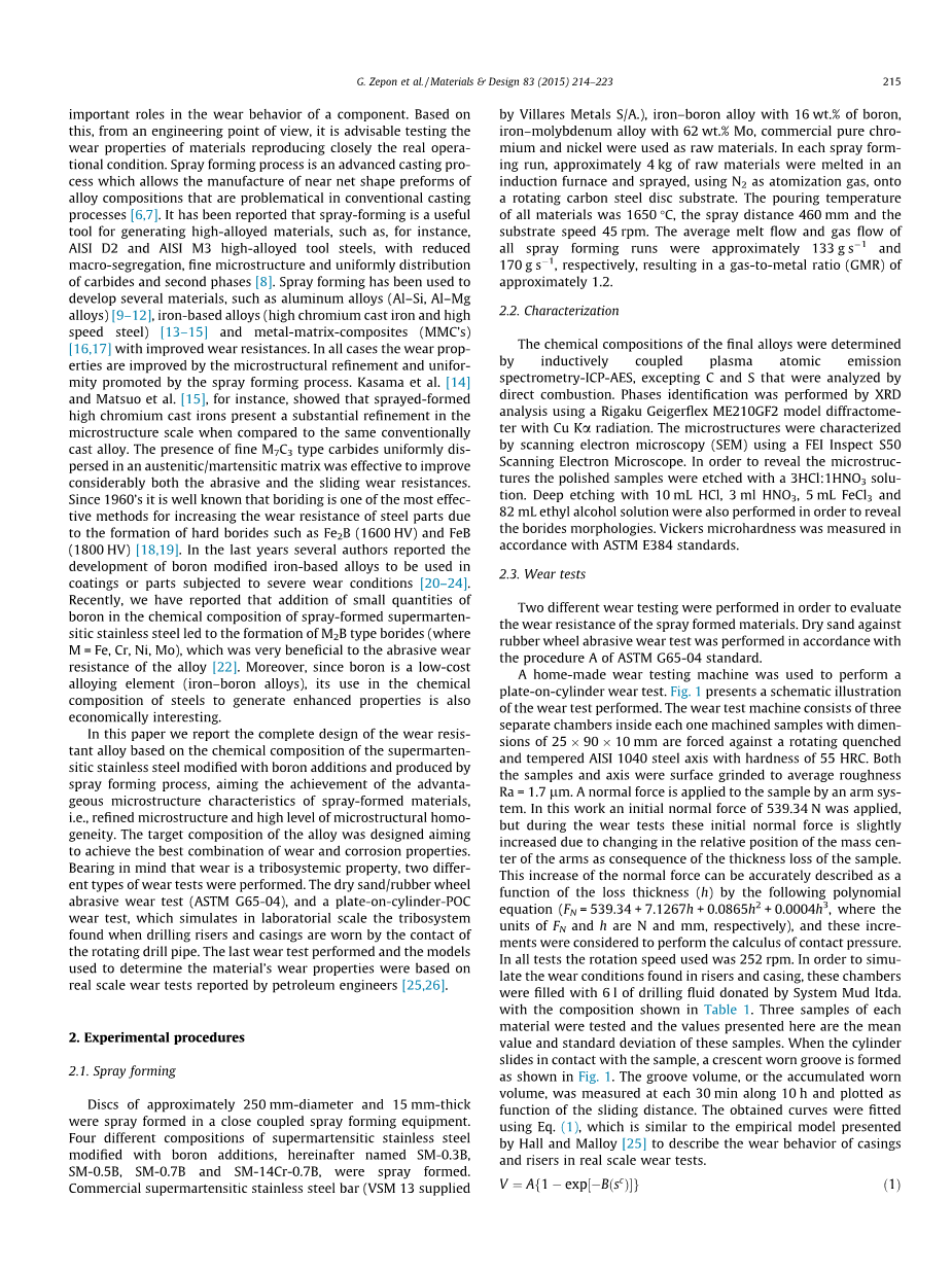 耐磨性不是材料的固有性质, 而是一种摩擦系统的性质, 在接触材料、相互运动类型、相对速度、负载水平、环境条件、磨料颗粒和润滑剂等条件存在的情况下, 可以发挥组件在磨损行为中的重要作用。在此基础上, 从工程的角度出发, 对材料的磨损性能进行严格的测试, 并对实际操作条件进行了研究。喷雾成形工艺是一种先进的铸造工艺, 允许制造在传统铸造过程中有问题的合金组合物预制件[6,7]。据报道, 喷雾成型是一种有用的工具, 以产生高合金材料, 例如, D2 和 M3 高合金工具钢, 降低了宏观离析, 具有精细显微结构和均匀分布的碳化物和第二阶段。[8]喷雾成形已被用来开发多种材料, 如铝合金 (Al–Si, Al–Mg 合金)[9-12], 铁基合金 (高铬铸铁和高速钢) [13-15]和金属基体复合材料 (MMC)[16,17], 提高耐磨性。在各种情况下, 通过喷雾成形过程所形成的显微组织具有细化和均匀性, 提高了磨损性能。例如, 表明, 喷射形成的高铬铸铁在微观结构与同常规铸造合金相比, 呈现出实质性的细化。M7C3 型碳化物均匀分散在奥氏体/马氏体型基体中的存在, 有效地改善了磨料和滑动磨损阻力。自1960年以来, 由于 Fe2B (1600HV) 和 FeB (1800HV) 等硬硼化物的形成, 硼是提高钢件耐磨性最有效的方法之一[18,19]。在过去的几年中,一些作者报告了硼改性的铁基合金的开发,该合金将用于经受严重磨损条件的涂层或部件中[20-24]。最近, 我们报告说, 在喷射形成的超级马氏体不锈钢的化学成分中添加少量的硼导致了 M2B 型硼化物 (其中 M = 铁, 铬, 镍, 钼) 的形成, 这是非常有利于磨料磨损合金的电阻。此外, 由于硼是一种低成本的合金元素, 它在钢的化学成分中的使用,对于控制经济成本也很有用。