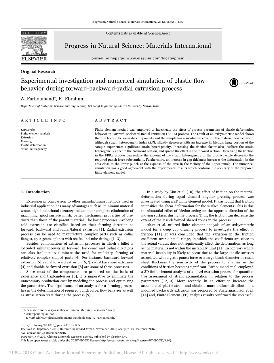 Altan等人利用深杯拉深过程轴对称模型的有限元分析来研究摩擦的影响[ 11 ]。得出的结论是,摩擦系数在小范围内的变化(其中摩擦系数接近实际值)不会显著影响变形,只要材料不在不稳定极限[ 11 ]内。相反,在由于与大的冲压力或大的坯料直径或小的板厚度相关的大的拉伸应力而可能发生材料不稳定性的情况下,该方法对摩擦条件变化的敏感性变得显著。Farhoumand等人采用一种新型挤压工艺的三维有限元分析,定量评估了与工艺参数[ 12,13 ]相关的应变累积。最近,为了增加累积塑性应变并获得更均匀的分布,Shatermashhadi等人提出了一种改进的反向挤压。[ 14 ]和有限元( FE )分析结果证实了改进工艺的成功实施。在易卜拉欣等人的另一项研究中。采用有限元分析研究了铜挤压过程中应变分布的均匀性,并对各种试样和工艺几何形状进行了优化。[ 15 ]。此外,Babaei等人还对挤压过程中的铜变形进行了数值模拟。使用商用有限元软件ABAQUS [ 16 ]。