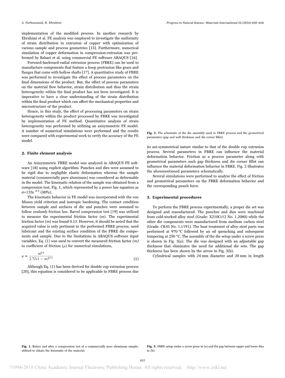 采用显式算法在ABAQUS有限元软件[ 18 ]中对轴对称FBRE模型进行了分析。冲头和冲模由于可忽略的弹性变形而被假定为刚性的,而样品材料(工业纯铝)在模型中被认为是可变形的。样品的运动学关系由压缩试验,图1,其由幂律方程表示为sigma;= 133ε0.3 ( MPa )。