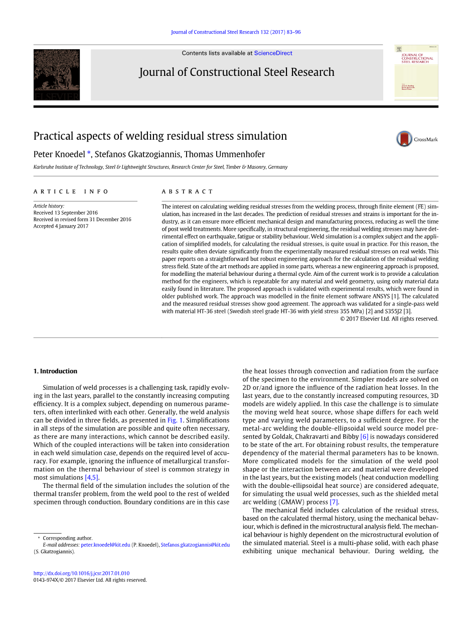 摘要:通过有限元(FE)模拟计算焊接过程中的焊接残余应力的兴趣在过去几十年中有所增加。残余应力和应变的预测对于工业来说是重要的,因为它可以确保更有效的机械设计和制造过程,减少焊后处理的时间。更具体地说,在结构工程中,残余焊接应力可能对地震,疲劳或稳定性行为产生不利影响。焊接模拟是一个复杂的课题,简化模型的应用,用于计算残余应力,在实践中是相当平常的。因此,结果经常与实际测量的实际焊接残余应力明显偏离。本文报告了一种简单但可靠的工程方法来计算残余焊接应力场。最先进的方法应用于某些部分,而提出了一种新的工程方法,用于对热循环期间的材料行为进行建模。目前工作的目的是为工程师提供一种计算方法,这种方法对于任何材料和焊接几何都是可重复的,仅使用文献中容易找到的材料数据。提出的方法通过实验结果验证,这些实验结果在较早发表的作品中发现。该方法在有限元软件ANSYS [1]中进行了建模。计算和测量的残余应力显示出良好的一致性。该方法对于具有材料HT-36钢(瑞典钢级HT-36,屈服应力为355MPa)[2]和S355J2 [3]的单程焊接验证。