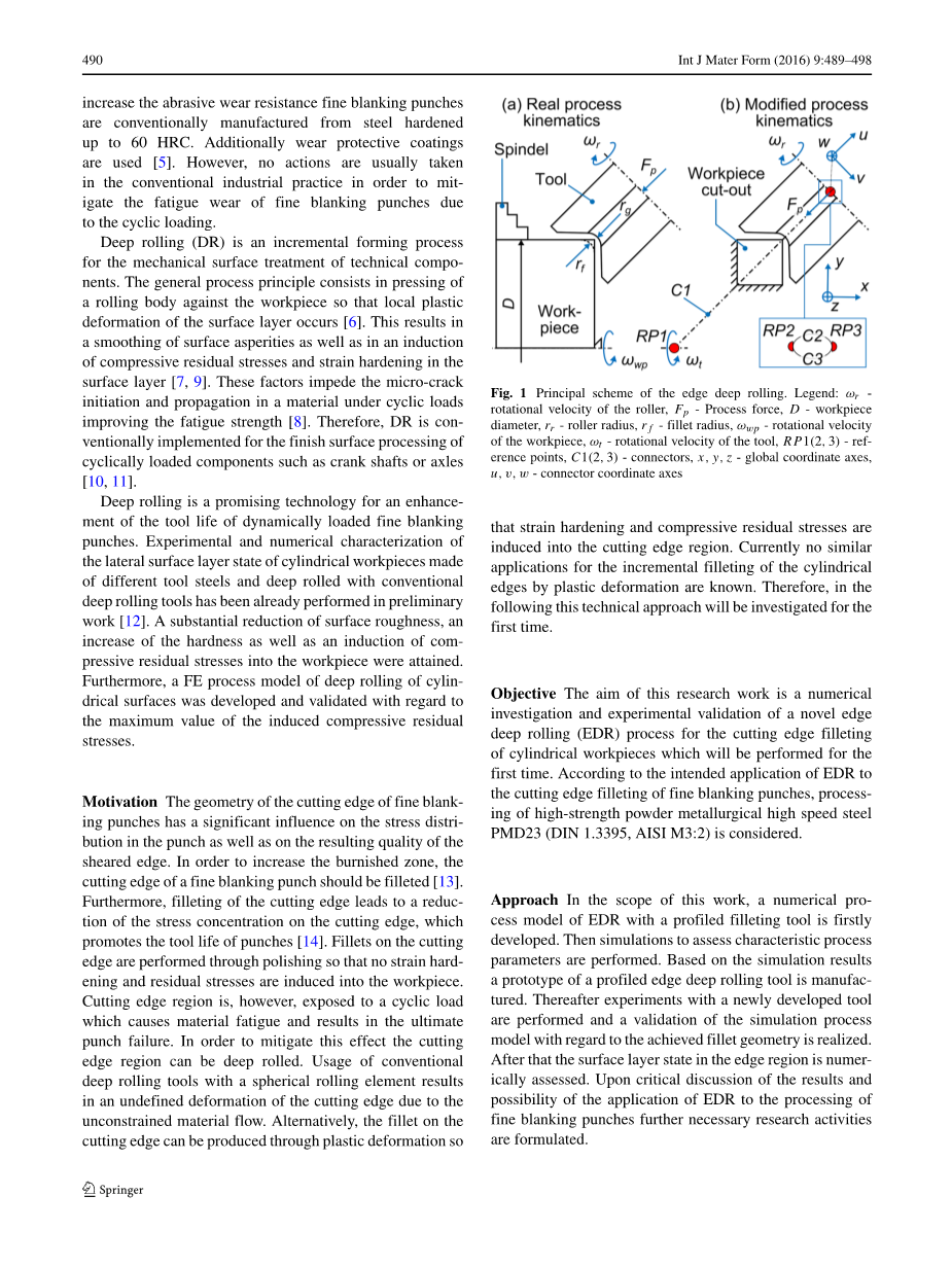 早期状态 精冲是一种批量生产加工方法,通常用于薄板金属成型。精冲件显著的特点是冲裁表面的高精度和高质量。在适当工艺参数条件下制造的精冲件可以直接用于与其他零件的装配,不用再经过其他后处理过程。精冲过程中冲头是受载最大的模具部件之一。因此,它是最容易受到磨损的。在冲裁过程中,由于金属板材被剪切时形成的阻力使模具冲头轴向方向受压。当冲压过程完成后,金属板料的回弹会在冲头四周造成接触压力。由于冲头和板材剪切边缘产生的摩擦力,在冲头轴向会产生拉应力。这会导致冲头的表面暴露在循环载荷之下,加快了冲头材料的疲劳速度。在注重能源利用率的环境下,通常通过使用高强度材料来实现机械部件的轻量化设计。除了高强度外,这些金属还具有高弹性系数,其特点就是高回弹特性。这些因素都将导致精冲模冲头受到更强烈的循环载荷并且加快其磨损速度。为了提高耐磨性,通常使用硬度超过60HRC的钢来制造精冲模具冲头,此外,传统制造过程中已经应用防磨损保护涂层用来减轻磨损。但是,工业实践中没有通用的方法来减轻模具冲头由于循环载荷产生的材料疲劳磨损。深滚压工艺(DR)是一个被越来越多用到的成型方法,对机械零件进行表面处理。一般的加工原理是滚刀滚压工件使其表面层产生塑性变形,平滑工件表面粗糙度同时引起表面层的残余压应力和加工硬化。这些因素阻碍了经受循环载荷模具材料微观裂纹的出现和蔓延,提高了其疲劳强度。因此,深滚压通常被用来作为受到循环载荷零件的最终表面处理,例如曲柄或者轴类零件。深滚压用来提高动态受载的精冲冲头的零件寿命是有望成功的加工方法。由不同钢制成并用传统深滚压工具滚压的圆柱体工件的侧表面层状态的试验和数值特征在前期过程中已经测得。结果表明工件表面粗糙度降低、硬度增加并产生了残余压应力。此外,圆柱表面深滚压过程对于最大残余压应力的有限元模型被建立出来并经过验证。