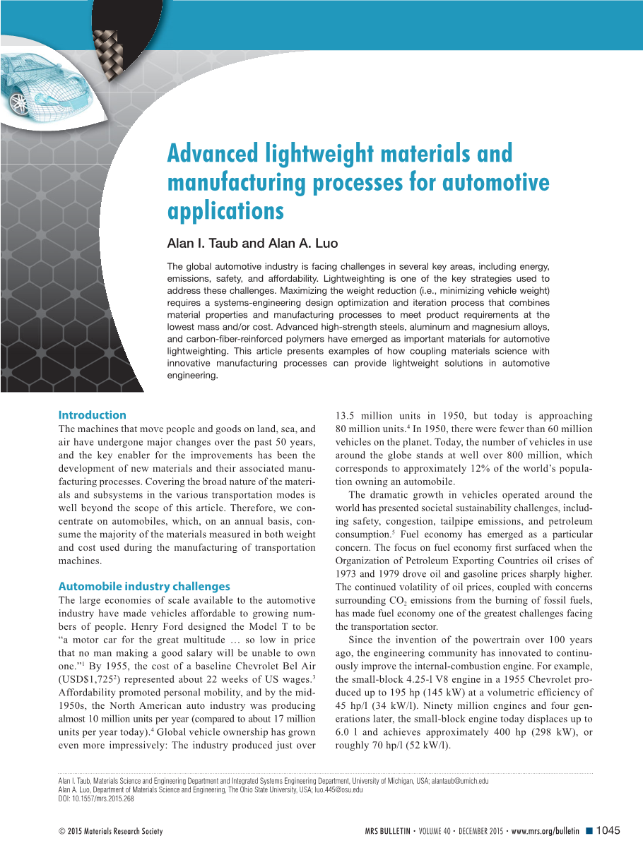 过去的50年里,在陆地,海洋和空中运送人员和货物的运输机器经历了巨大的变化,新材料及其相关制造工艺的开发是这些改进的关键促成因素。各种运输模式中的材料性质广泛,超出了本文的研究范围。因此,本文专注于汽车研究,汽车每年在制造过程中消耗的大部分材料的质量和成本都是绝对的。