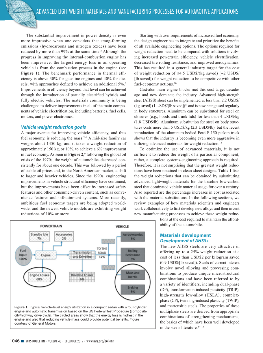 当考虑到烟雾形成排放(碳氢化合物和氮氧化物)减少超过99%时,功率有显着的改善。尽管改进内燃机的进展快速,但运行车辆中最大的能量损失来自发动机的燃烧过程(见图1)。汽油发动机的热效率基准性能高于30%,柴油发动机的热效率高达40%,其中定义方法为额定功率增加5%。通过引入部分电动混合动力车和全电动车,可以实现超出该水平的效率。材料界面临的挑战是如何改进车辆电气化的所有主要部件,包括电池、燃料电池、电机和电力电子设备。