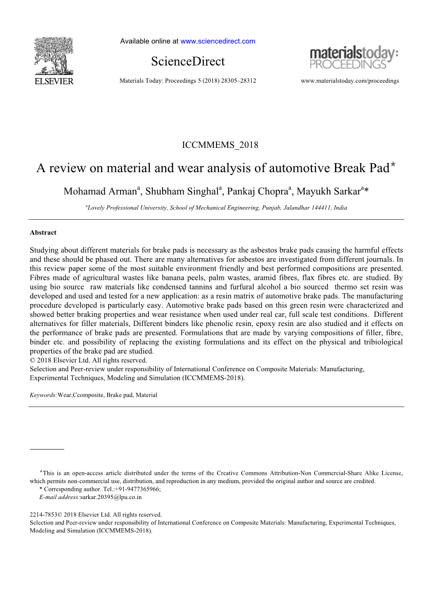 摘要:研究不同材料的刹车片是必要的,因为石棉刹车片会造成有害影响,因此应逐步淘汰。从不同的期刊上研究了石棉的许多替代品。本文介绍了几种最适合环境友好和性能最佳的复合材料。研究了由香蕉皮、棕榈渣、芳纶、亚麻纤维等农业废料制成的纤维。利用生物源性原料,如缩合单宁和糠醛醇,研制了一种生物源热性定型树脂,并将其作为汽车刹车片的树脂基体,进行了应用试验。开发的制造程序特别容易。以这种绿色树脂为基础的汽车刹车片,在实车试验条件下,具有较好的制动性能和耐磨性。研究了填充材料、酚醛树脂、环氧树脂等粘合剂的不同替代品,并就其对刹车片性能的影响。研究了由不同的填料、纤维、粘合剂等组成的配方,以及替代现有配方的可能性及其对刹车片物理和摩擦性能的影响。