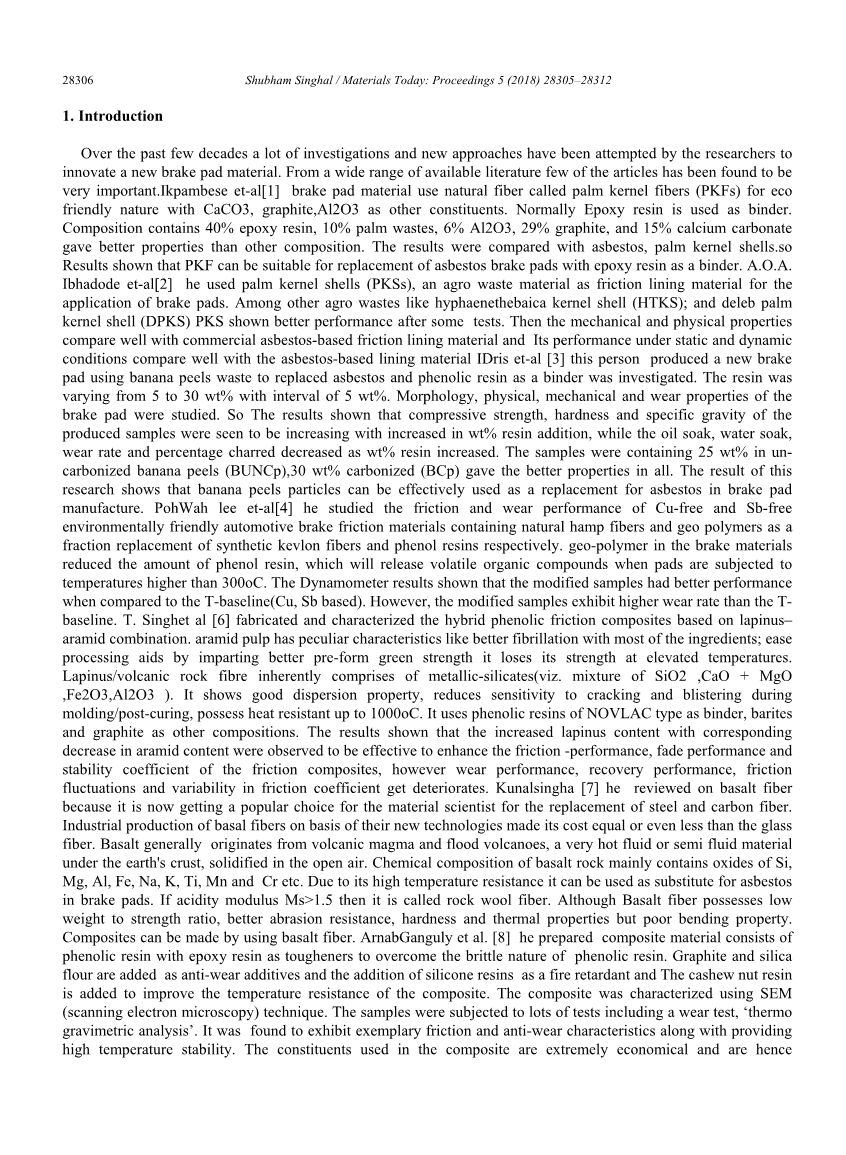 在过去的几十年中,研究人员尝试了大量的研究和新的方法来创造一种新的刹车片材料。从广泛的现有文献来看,很少有文章被发现是非常重要的。Ikpambese等人[1]使用天然纤维作为主要材料,称为棕榈核纤维(PKFs),以具有生态友好性质的碳酸钙、石墨、三氧化二铝为其他成分。通常环氧树脂用作粘合剂。其中环氧树脂占40%,棕榈渣占10%,氧化铝占6%,石墨占29%,碳酸钙占15%,性能优于其它组分。通过与石棉、棕榈核壳的对比研究,结果表明,PKF可以替代以环氧树脂为粘合剂的石棉刹车片。A.O.A.Ibhadode等人[2]使用棕榈核壳(PKFs),一种农业废料作为摩擦衬片材料,用于制动片的应用。在其他农业废弃物中,例如,连丝酵母棕榈内核壳(HTKS)和德莱布棕榈树内核壳(DPKS)PKS在一些测试后表现出更好的性能。然后将其力学性能和物理性能在静态和动态条件下与市售石棉基摩擦衬片材料进行了比较,IDris等人[3]用香蕉皮废料代替石棉和酚醛树脂作为制动衬片,研制了一种新型制动衬片。调查了树脂的含量从5%到30%,间隔为5%,刹车片的形貌、物理性能、机械性能和磨损性能。结果表明,随着树脂加入量的增加,试样的抗压强度、硬度和比重均增大,而浸油、浸水、磨损率和炭化率随树脂加入量的增加而降低。最终含25%炭化和30%炭化的香蕉皮综合性能较好。研究结果表明,香蕉皮颗粒在刹车片制造中可以有效地替代石棉。Pohwa Lee等人[4]研究了含天然HAP纤维和土工聚合物的无铜和无锑环保汽车制动摩擦材料作为合成凯文龙纤维和酚醛树脂的部分替代物的摩擦磨损性能。刹车材料中的土工聚合物减少了苯酚树脂的含量,当刹车片的温度高于300℃时,这些树脂会释放出挥发性有机化合物。测试结果表明,与T基线(基于铜、锑)相比,改进后的样品具有更好的性能。然而,改性样品的磨损率高于T基线。T.辛格制备并表征了基于拉皮努斯-芳纶组合的复合酚醛摩擦材料。芳纶浆粕具有特殊的特性,如对大多数原料有更好的原纤化作用;通过赋予预成型更好的绿色强度来减轻加工助剂的压力,它在高温下会失去强度。拉皮努斯火山岩纤维固有地由金属硅酸盐(即SiO2、CaO MgO、Fe2O3、Al2O3)的混合物。具有良好的分散性,降低了成型后固化过程中对开裂和起泡的敏感性,耐热性高达1000℃。它使用酚醛树脂作为粘合剂,重晶石和石墨作为其他成分。结果表明,随着芳纶含量的降低,拉皮努斯含量的增加对提高摩擦复合材料的摩擦性能、褪色性能和稳定性系数是有效的,而磨损性能、回复性能、摩擦波动和摩擦系数的变异性等对提高摩擦复合材料的摩擦性能有显著恶化作用。Kunalsingha[7]他回顾了玄武岩纤维,因为它现在正成为材料科学家替代钢铁和碳纤维的热门选择。在新技术的基础上进行基础纤维的工业生产,使其成本等于甚至低于玻璃纤维。玄武岩通常起源于火山岩浆和洪泛火山,这是地壳下一种非常热的流体或半流体物质,在露天凝固。玄武岩的化学成分主要含有Si、Mg、Al、Fe、Na、K、Ti、Mn、Cr等氧化物,由于其耐高温性,可替代刹车片中的石棉。如果酸度模量msgt;1.5,则称为岩棉纤维。玄武岩纤维虽然具有较低的重量强度比、较好的耐磨性、硬度和热性能,但弯曲性能较差。复合材料可以用玄武岩纤维制成。Arnabganguly等人[8]为克服酚醛树脂的脆性,制备了以环氧树脂为增韧剂的酚醛树脂复合材料。加入石墨和硅粉作为耐磨添加剂,加入硅树脂作为阻燃剂,加入腰果树脂提高复合材料的耐温性。用扫描电子显微镜对复合材料进行了表征。样品进行了大量试验,包括磨损试验、热重分析。它被发现表现出典型的摩擦和耐磨特性,同时提供高温稳定性。复合材料中使用的成分非常经济,因此适用于工业应用。P.V.Gurunath等人[9]在制动片材料中使用了新的树脂,因为酚醛树脂具有严重的缺点和局限性,如有害挥发物的演变(即NH3(氨)、HCHO(甲醛)等)在常温固化过程中,保质期极短。结果表明,新研制的树脂基复合材料与传统酚醛树脂基复合材料相比,具有优异的性能。这些特性反映了材料在许多工作条件下的性能,在这些条件下,衬垫的表面温度可能会超过400℃。这表明取代商用酚醛树脂的潜力很大。实验室规模制备研究也表明,新树脂的合成成本相对低于酚醛树脂。在实验过程中,他们注意到树脂、复合材料的强度特性和它们的磨损行为之间没有相关性。Yun Cheol Kim等人[5]使用盘式摩擦试验机研究了醛化物固化的酚醛树脂、钛酸钾晶须和腰果壳液(CNSL)的摩擦学性能。纤维采用芳纶浆、岩棉、钛酸钾的混合物。但在本研究中,仅研究了酚醛树脂、钛酸钾和CNSL对摩擦材料物理性能的影响。埃里克森等人[10]对制动片表面形貌与声音发生之间的关系进行了调查。在无声和噪音条件下中断试验后,对制动片表面进行了表征。试验中使用的刹车片是两对金属纤维增强有机刹车片。一对是沃尔沃850的标准生产配方,另一对为提高高速性能而稍微重新配方。研究结果表明,在衬块对铸铁盘的滑动作用后,接触平台的平面面积在粗糙的周围上升了几微米。奥斯特勒等[11]对制动模拟过程中发生的化学和微观结构变化进行了研究。在这一过程中,对传统的盘式制动衬块材料的表面进行了一系列的往复试验。利用扫描电子显微镜和能量色散X射线光谱(SEM/EDS)、选区衍射(SAD)和透射电子显微镜(TEM)等表征技术,对试验前后的化学变化进