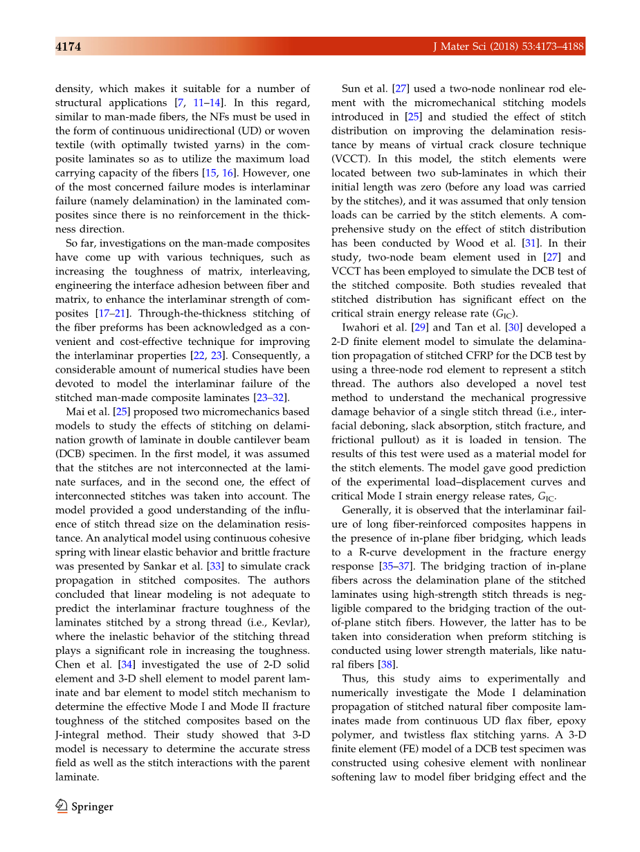 到目前为止,对人造复合材料的研究已经提出了各种技术,如增加基体的韧性,交错,设计纤维与基体之间的界面粘合,以提高复合材料的层间强度[17-21]。 纤维预制件的全厚度缝合已被公认为一种方便且具有成本效益的技术,可用于改善层间性能[22,23]。因此,大量的数值研究致力于模拟缝合人造复合材料层压板的层间失效[23-32]。