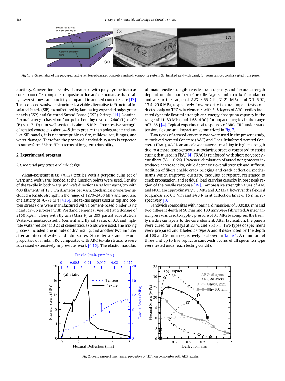 使用具有在接合点处粘合的垂直组的经纱和纬纱的耐碱玻璃(ARG)纺织品。经纱和纬纱方向上织物的密度为四根纱线/厘米,每根纱线具有400根直径为13.5微米的细丝。机械性能包括1270-2450 MPa范围内的拉伸强度和70-78 GPa的弹性模量。用作顶部和底部应力表层的织物层是用水泥基粘结剂与波特兰水泥(I / II型)一起以3150kg / m 3的剂量与飞灰(F类)一起使用手糊法制造的,作为20%部分替代。使用0.3水灰比固体(水泥和粉煤灰)比例和0.2%水泥固体的高比例减水剂。混合过程包括干混1分钟,加入水和外加剂2分钟。类似的TRC复合材料与ARG纺织品结构的静态拉伸和弯曲性能在以前的工作中被广泛讨论。弹性模量,极限拉伸强度,拉伸应变能力和弯曲强度取决于织物层和基质配方的数量,并且在2.23-3.55GPa,7-21MPa和3.1-5.9%,13.4-20.6 MPa。仅在具有6-8层ARG纺织品的TRC蒙皮元件上进行的低速弯曲冲击测试表明在11-30MPa范围内的动态弯曲强度和能量吸收能力,以及在7-7范围内的冲击能量为1.68-4.90J -35 。 ARG-TRC在静态张力,弯曲和冲击下的典型实验响应总结在图2中。