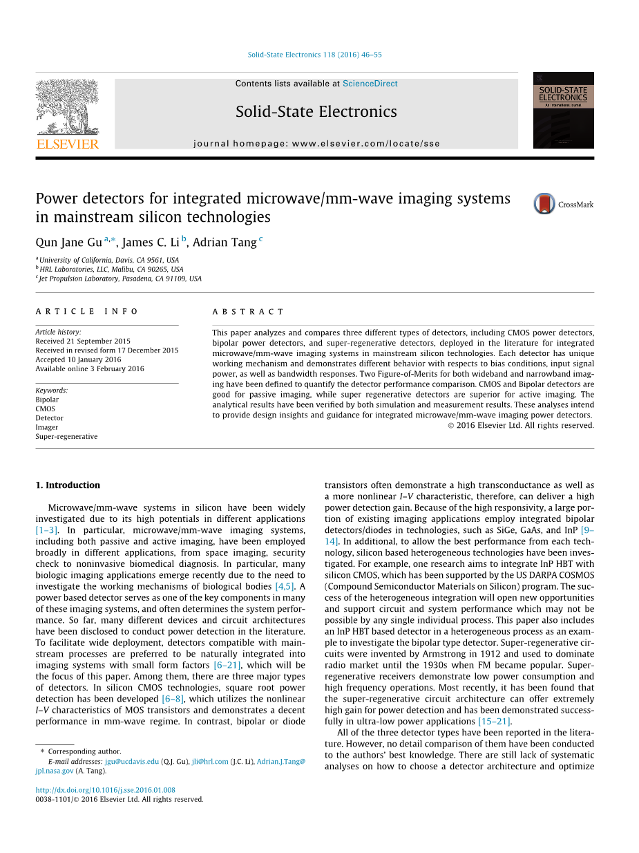 两种基于设备的功率检测器广泛用于集成成像系统。一个是CMOS功率检测器,另一个是双极功率检测器。由于基于二极管的功率检测器具有类似的I / V关系并且与双极型检测器具有类似的设计考虑因素,因此它被纳入双极检测器类别.