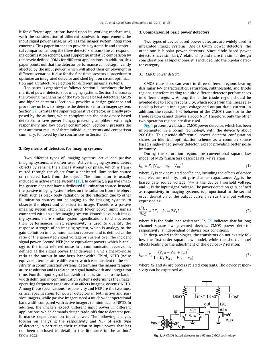 所有三种类型的探测器都在其他的文章中有所提及。然而,没有相应的对它们进行详细的比较。目前还缺乏对如何选择探测器架构和进行优化的系统分析,没有根据其工作机制针对不同的应用,考虑不同的带宽要求,输入信号功率范围以及成像系统集成问题。本文旨在对这三种探测器进行系统和理论的比较,讨论相应的优化方案,并支持新定义的FOMs在不同应用中的定量比较。另外,本文指出,探测器的性能可能会受到输入功率的显着影响,这将影响他们在不同场景下的使用。本文也首次提出了优化集成探测器的流程,并阐明了不同成像系统的电路优化和架构选择。本文的结构如下:第2节介绍了成像系统功率检测器的主要优点。第3节讨论了两种基于设备的探测器的工作机制:CMOS和双极探测器。第4节提供了关于如何将探测器集成到成像仪系统的设计指导和程序。第5节阐述了作者最初提出的超再生探测器,它补充了基本的基于设备的探测器,以及节省耗电量大、功耗低的前置放大器。第6节介绍了三个独立检测器的测量结果和比较总结。最后是第7节的结论。