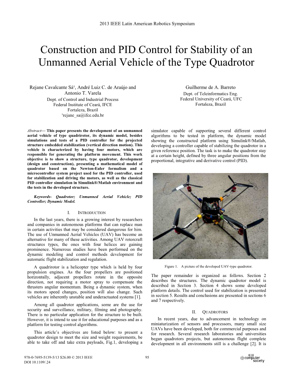 在巴西,有几个研究小组对四旋翼机进行研究。埃斯皮里托-桑托联邦大学(Federal University of Espiacute;rito Santo)的论文仅限于设计、硬件和固件结构,该结构允许实施一些控制技术[7],另一个四旋翼机是由北里奥格兰德多联邦大学(Federal University of Rio Grande do Norte)和桑塔纳州立大学(State University of Feira de Santana)合作开发的,平台将是用于监测石油设施、配电系统和电力传输[8]等平台。