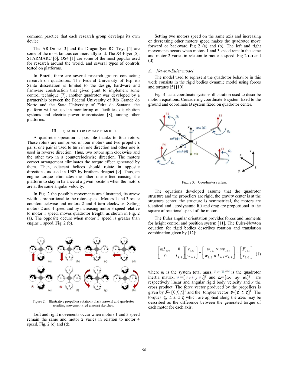 由于有四个旋翼,四旋翼操作是可能的。这些旋翼由四个电机和两对螺旋桨组成,一对用于单向转动,另一对用于反向转动。因此,两个旋翼顺时针旋转,另两个逆时针旋转。电动机的正确布置消除了它们产生的转矩效应。然后,相邻的螺旋线应该以相反的方向旋转,如布列盖特兄弟在1907年所使用的[9]。因此,当马达处于相同的角速度时,发动机扭矩消除了导致平台在给定位置保持平衡的另一个影响。