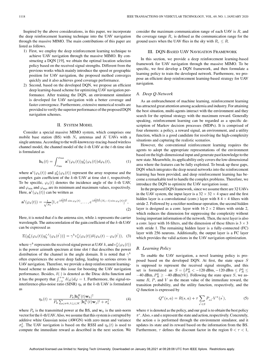 表示无人机接收的信号功率;为时间槽处的功率方位角谱,其描述了信道在角度域的功率分布。经常经历严重的深衰落导致无人机导航的严重误差。因此,我们提出了一种基于深度强化学习的方案来解决这一问题,以提高无人机的导航性能。此外,表示狄拉克函数,具有性质。进一步推导出第个无人机的信噪比为