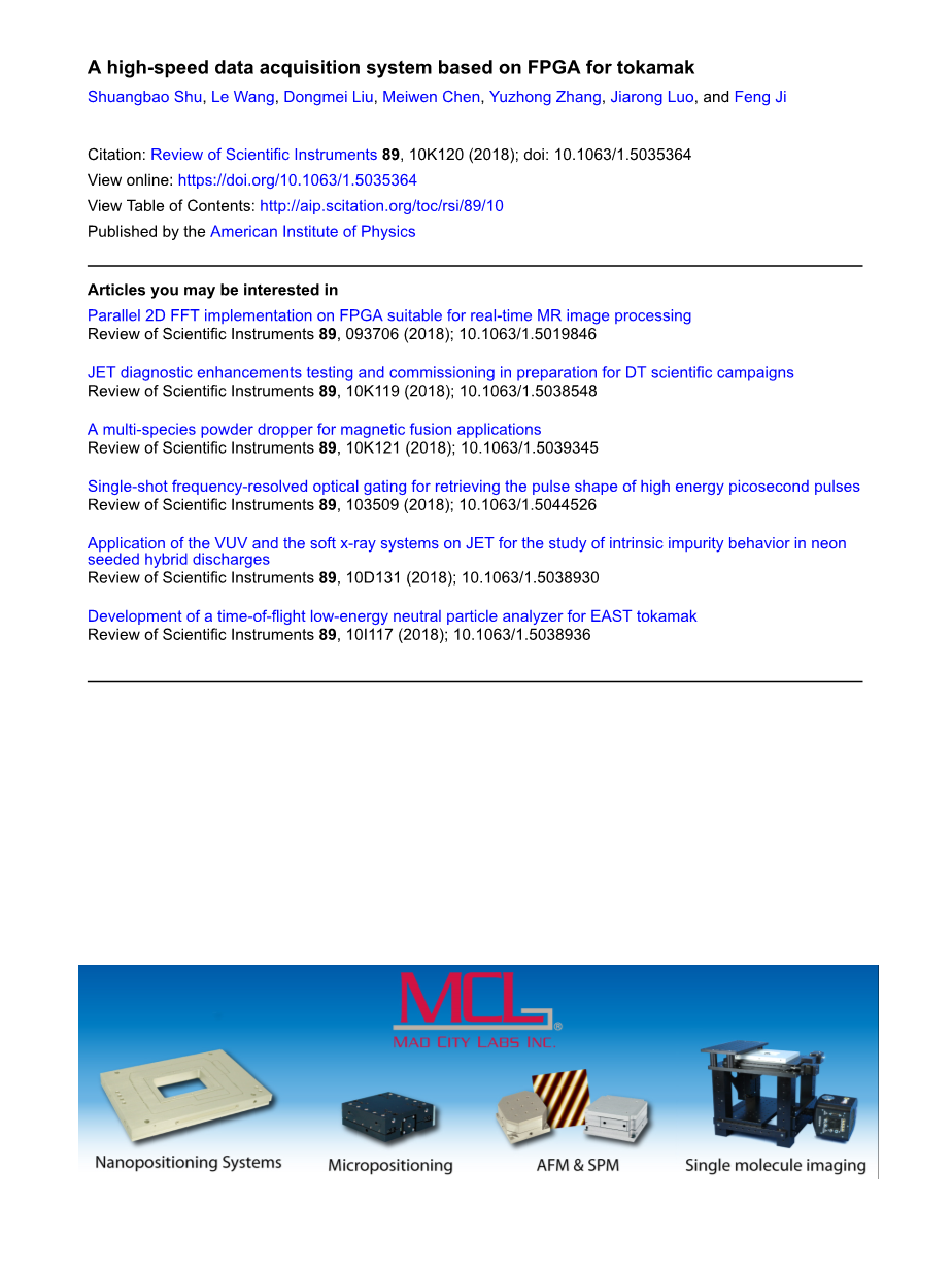 具有实验先进性的超导体tokamak(EAST)装置旨在在1000 s内实现稳态和长脉冲放电。本研究为EAST设计了一种基于现场可编程门阵列(FPGA)的嵌入式高速数据采集系统。一款Cyclone公司FPGA产品被用作主芯片,而TI的模数转换(ADC)芯片被用于完成ADC。一块采集系统板由四个ADC芯片组成。所获取的数据经过压缩,并通过PCI(Peripheral Component Interconnect)Express接口存储到磁盘阵列中,然后上传到数据服务器。一块板可以同步采集八个通道的信号。许多这样的板可用于收集其他通道信号。实验结果表明,该系统在连续采样1250 s的情况下可以达到80 MSps,采样精度可以达到12位。该系统将信号调理,数据采集和数据处理集成到一块板上,并提供具有高集成度和可移植性级别的架构。AIP Publishing发布。https://doi.org/10.1063/1.5035364