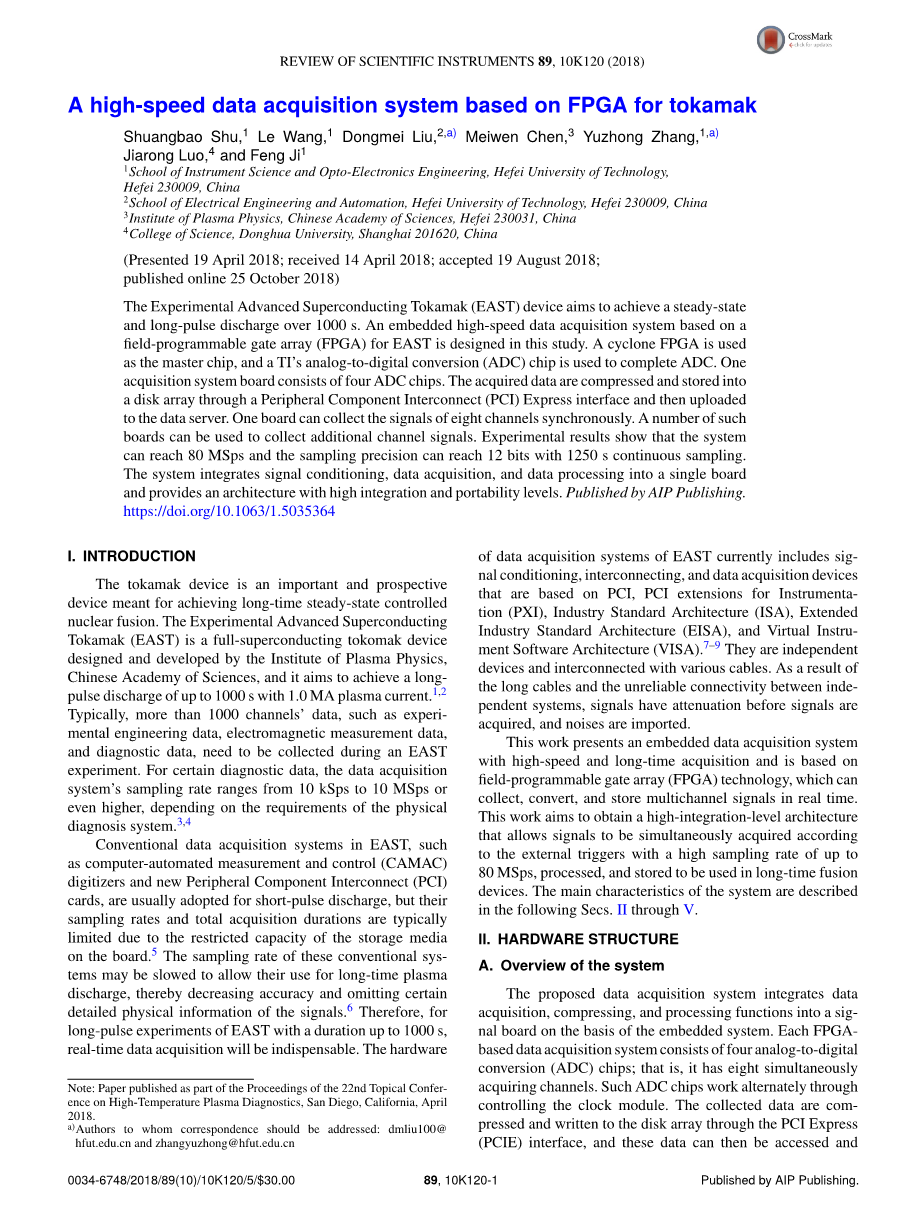 tokamak装置是一种重要且有前景的装置,旨在实现长期的稳态受控核聚变。 具有实验先进性的超导体tokamak(EAST)是由中科院等离子体物理研究所设计和开发的全超导tokamak装置,旨在在1.0 MA等离子体电流下实现长达1000 s的长脉冲放电。通常,在EAST实验中需要收集1000多个通道的数据,例如实验工程数据,电磁测量数据和诊断数据。 对于某些诊断数据,数据采集系统的采样率范围从10 KSps到10 MSps甚至更高,具体取决于物理诊断系统的要求。