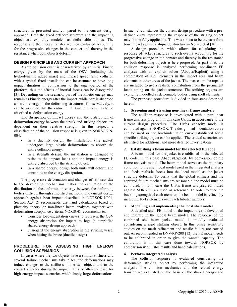 本文提出了一个评估固定海洋结构与海上服务船(OSV)或其他浮式结构物高能碰撞下的碰撞响应的流程。提出了将用于筛选目的的传统框架非线性分析和更详细的运用显式的非线性有限元分析结合起来的方法。在详细的综合有限元分析中,固定海上结构和冲击船明确建模为变形体。充分考虑两个变形物体的接触和阻力的渐进变化,与分别评估两个物体的阻力的方法相比,能够获得更准确的结果。