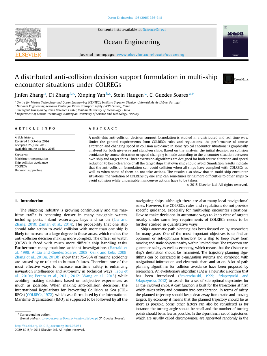 航运业持续增长,许多通航水域的海上交通日益密集,包括港口、内河航道、海湾等。在这些区域,一艘船应该采取行动避免与多艘船相撞的概率很可能会大幅度增加,这使得船舶的避碰决策更加复杂。驾驶员面临着更加困难的船舶处理任务。此外,许多海上事故调查表明,75-96%的海上事故是由人类失误引起或与之相关的。因此,提高海上安全的最有效途径之一是以技术手段提高航行智能和自主性尽量避免基于主观经验的决定。国际海事组织(海事组织)制定的“国际海上防撞规则”(COLREGS,1972)做出避碰决定时, 虽然也有许多本地的导航规则,但所有的航行船都应该遵循。然而,国际海上避碰规则的规则和条例并没有提供具体的指导,特别是在多船遭遇情况下。如何以智能方式做出决策以避免附近的目标,对国际海上避碰规则的一些关键要求还需要从定量的角度做进一步的研究。
