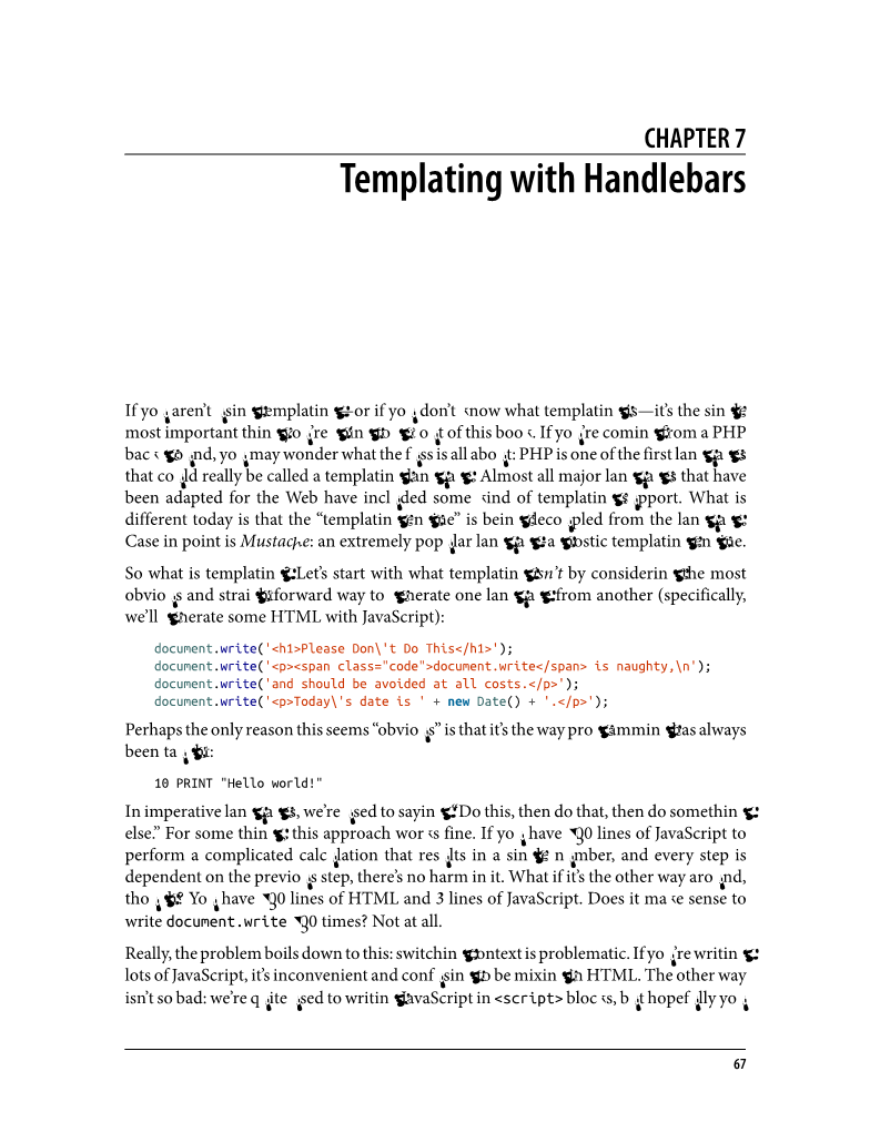 那么到底什么是模板?让我们首先看看模板不是什么,我们以最明显也最直接的方式用一 种语言生成另外一种语言(具体来说,我们会使用 JavaScript 生成一些 HTML):