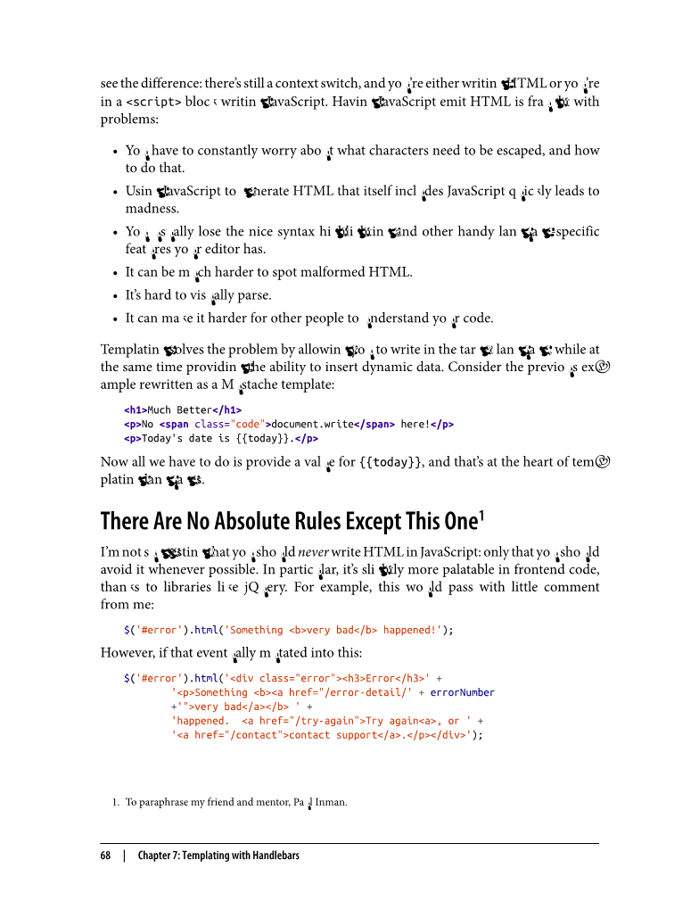 事实上,问题出现在这里:切换上下文环境是困难的。如果你写了大量的 JavaSctipt,混合在 HTML 中会引起麻烦和混乱。另一种方法并不糟糕:我们已经习惯了在 lt;scriptgt; 块 中写 JavaScript,但希望你能了解这个差异:这仍然会有上下文切换的问题,你或者只写 HTML,或者只在 lt;scriptgt; 块中写 JavaScript。由 JavaScript 生成的 HTML 充满了问题: