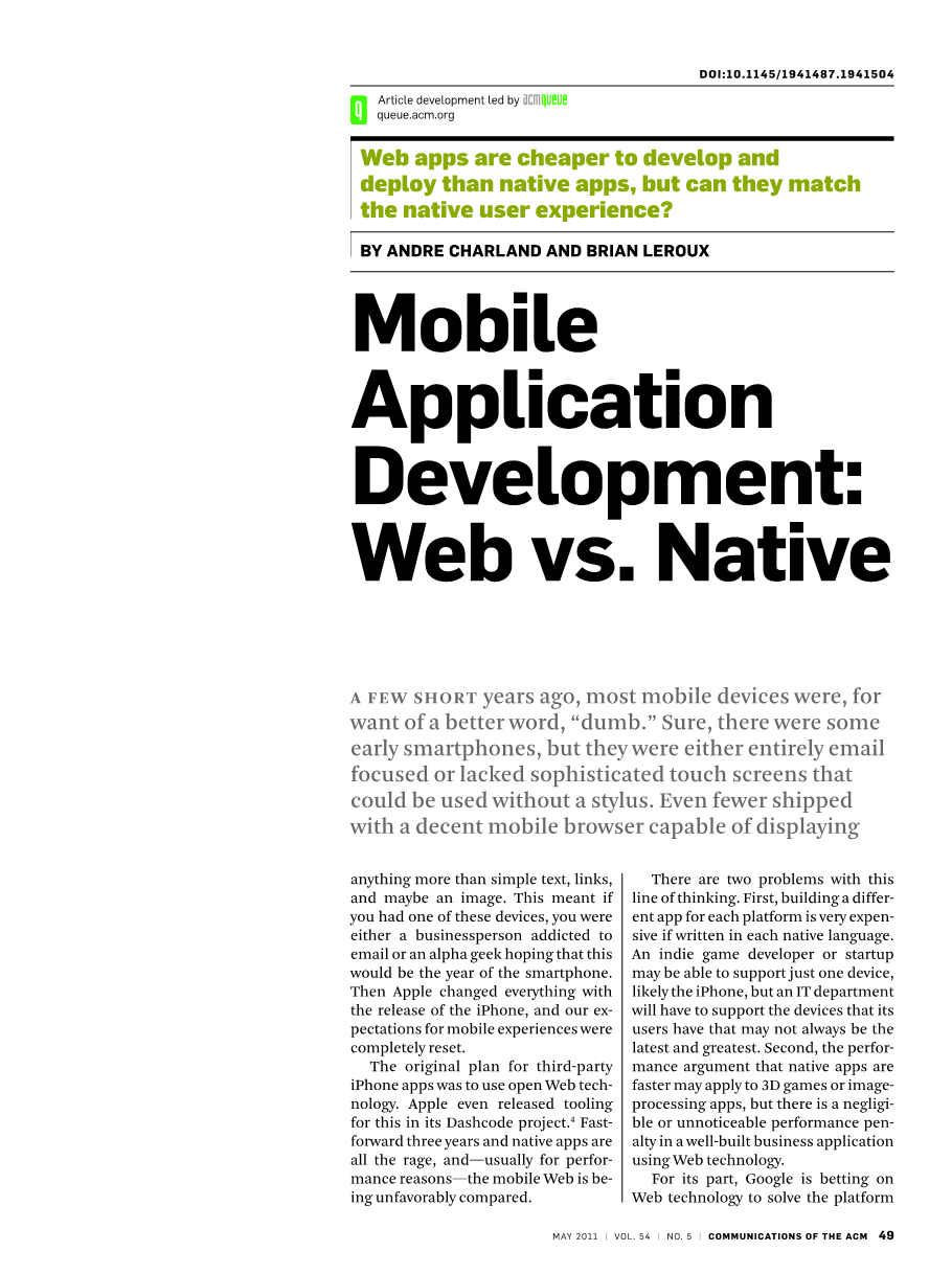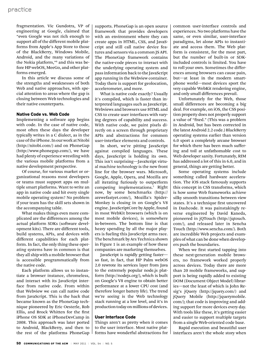 执行一个软件应用程序是从执行代码开始。对于Native代码,这几天最经常开发人员通常在写 C 语言,iPhone 是一例。在我们的工作在 Nitobi (http://nitobi.com/) 和 PhoneGap (http://www.phonegap.com/),我们有丰富的经验与各种移动平台从Native开发角度进行对比适配。