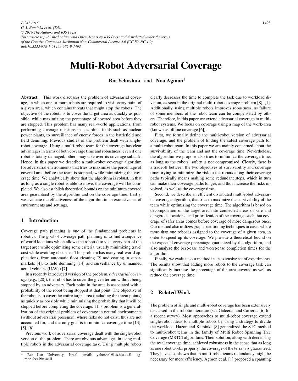 关于离线的单机器人对抗覆盖问题在文献[21]中已被正式定义,在文献中我们提出一种简单的启发式覆盖路径生成算法,其目标是最小化机器人生存能力和覆盖路径长度的总代价。该启发式算法仅适用于无障碍物区域,且不具有鲁棒性。在后一篇文献[22]中,我们对该问题进行了更具体地讨论,即找到最安全的覆盖路径。这里我们提出两种启发式算法:STAC,一种基于扩展树的覆盖算法,以及GAC,基于贪心方法。我们得到结果表明:虽然STAC倾向于获得比预期更高的覆盖率,但GAC产生的覆盖路径更短,累积风险更低。在文献[18]中,我们基于对抗环境建立了一个更加复杂的模型,在这个模型中,我们可以选择威胁点的最佳位置,使得该位置停止机器人完成覆盖任务的概率最大化。最后,在文献[19]中我们给出了该问题的在线单机器人版本的解决方案。