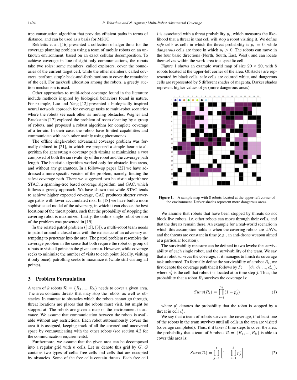 之前对抗覆盖问题通过单个机器人解决的。但用多机器人完成对抗覆盖任务的优点也非常明显。使用多机器人会因为任务负载的分散明显减少完成任务的时间,就像我们看到的一般的多机器人覆盖问题[8],[1]。除此之外,使用多机器人会提高鲁棒性,即使群体中有部分机器人出现问题,可以通过群体中的其他机器人来进行补偿。因此,在本文中我们扩展为多机器人系统来解决对抗覆盖问题。我们通过工作区地图(通过离线覆盖得到该地图[6])来判断他们的覆盖率。