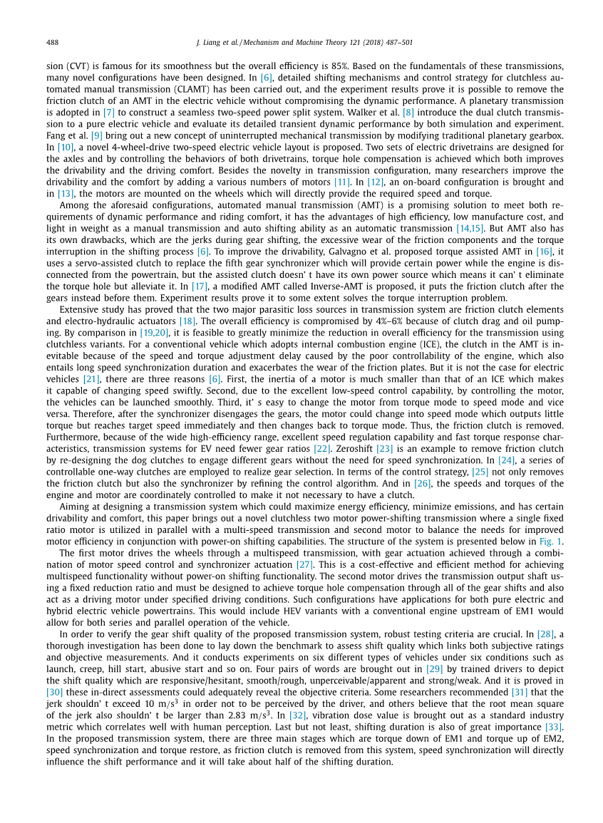 动力性能和乘坐舒适性要求,具有效率高,制造成本低,重量轻的优点,作为手动变速器和自动变速器的自动变速能力。但AMT也有其自身的缺点,即换档期间的颠簸,摩擦部件的过度磨损以及换档过程中的扭矩中断。为了提高驾驶性能,提出的扭矩辅助AMT,它使用伺服辅助离合器来代替第五档同步器,当发动机与动力传动系统断开时,第五档同步器将提供一定的动力,但辅助离合器没有自己的动力源,这意味着它不能消除扭矩孔但减轻它。提出了一种名为Inverse-AMT的改进型AMT,它将摩擦离合器置于齿轮后面而不是它们之前。实验结果证明它在一定程度上解决了扭矩中断问题。