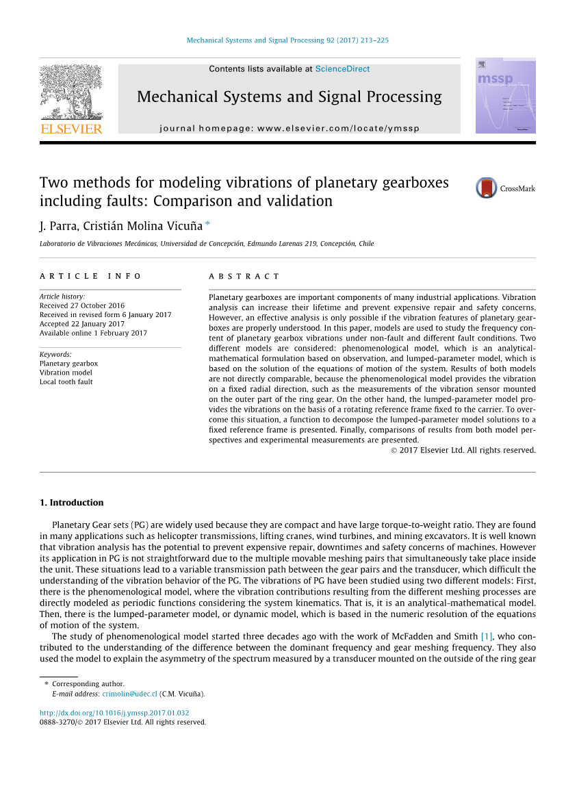 此研究探讨了在良好和故障的条件下,利用集中参数模型和现象学模型,来研究一种均匀分布的行星齿轮的频率内容。故障被认为是太阳齿轮、行星齿轮和齿圈的局部故障。为了将光参量模型与现象学模型结果和实验测量结果(考虑到与局部故障有关的额外频率分量)进行比较,我们提出了一种方法,这种方法为旋转框架的分解提供了一种解决方案,用于固定参考系振动。
