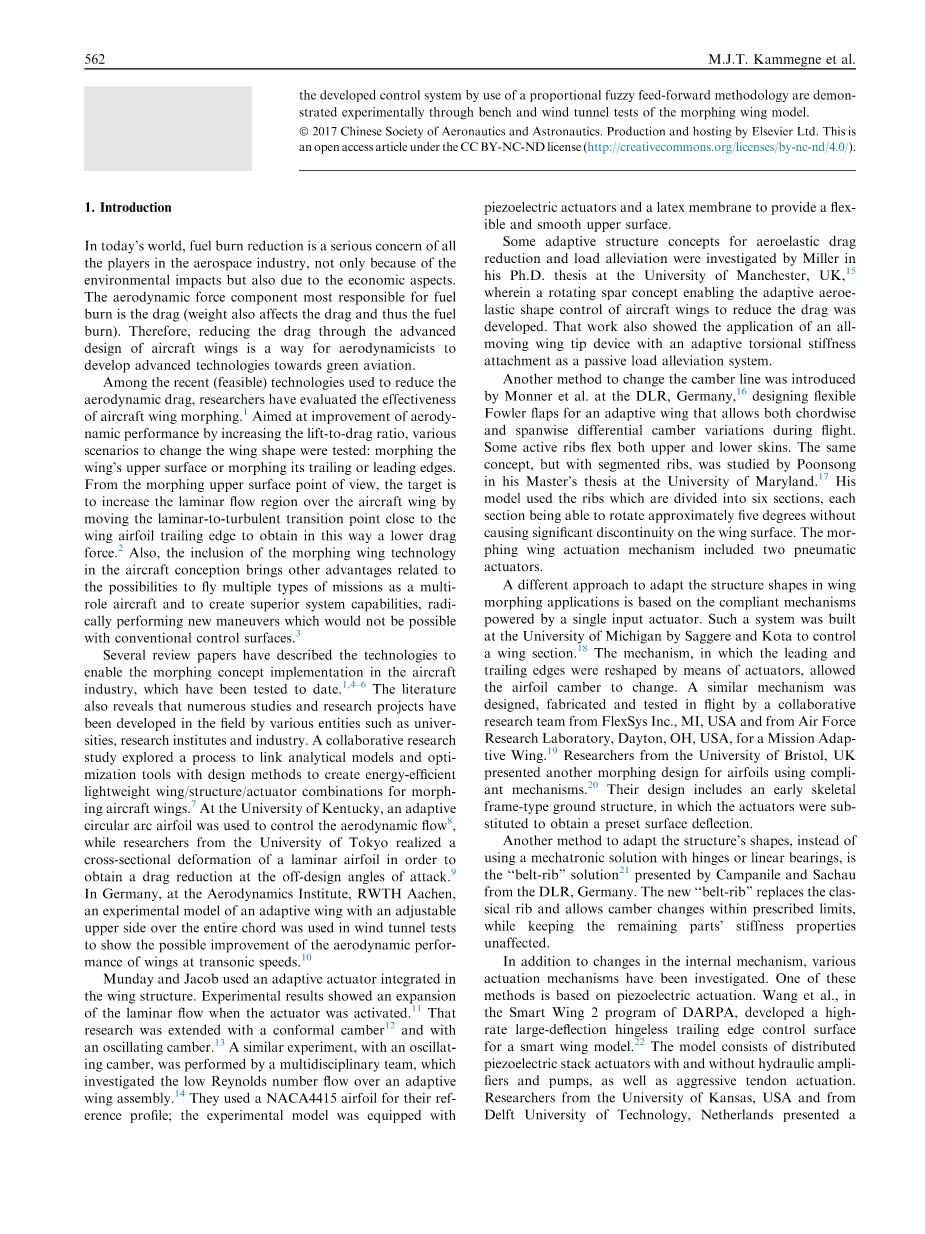 文献还表明,许多研究和研究项目都是由多个实体(如大学、研究机构和工业)在该领域开发的。一项协作性研究探索了一个将分析模型与光学模型联系起来的过程。具有设计方法的优化工具,用于为变形飞机机翼创建节能的轻型机翼/结构/执行机构组合。肯塔基大学的自适应圆弧翼型用于控制空气动力流,而东京大学的研究人员实现了一个层流的横截面变形。翼型为了在偏离设计迎角时获得减阻。在德国亚琛RWTH空气动力学研究所,风洞试验中使用了一种上弦可调的自适应机翼的实验模型,以证明跨音速机翼气动性能可能得到改善。Munday和Jacob使用了集成在机翼结构中的自适应执行器。实验结果表明,当促动器被激活时,层流的扩展。研究扩展到保形曲面和振荡曲面。由一个多学科团队进行了类似的实验,该团队研究了自适应WI上的低雷诺数流。使用NACA4415翼型作为参考剖面;实验模型配备了压电驱动器和乳胶膜,提供一个灵活和光滑的上表面。