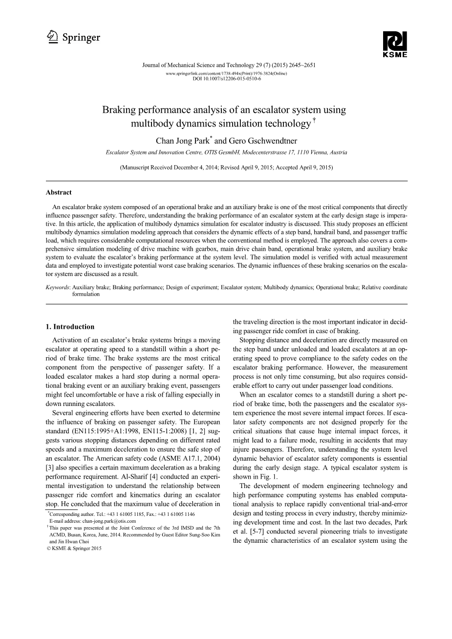 在本次研究中,采用有效的多体动力学仿真建模方法来考虑阶梯带,扶手带和载荷的动态效应,如果应用传统的仿真建模方法,这会消耗大量的计算资源。本研究还包括带有齿轮系,主传动链带,操作制动系统和辅助制动系统的驱动机器的综合仿真建模,以执行完整自动扶梯系统的制动性能分析。仿真模型通过从实际自动扶梯获取的测量数据进行验证。使用经过验证的仿真模型,研究了主要安全部件的动态稳定性,包括系统参数,例如不同类型的制动系统激活,乘客负载条件和主驱动链带的操作条件。因此,仿真结果可以为设计工程师提供最关键情况的重要信息,并设计出即使在早期设计阶段也能防止它们的措施。