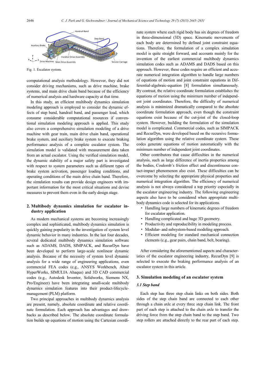 现代工程技术和高性能计算系统的发展使得计算分析能够在每个行业中快速取代传统的反复试验设计和测试过程,从而最大限度地缩短开发时间和成本。 在过去的二十年中,Park等人[5-7]进行了几项开创性的试验,以使用计算分析方法研究自动扶梯系统的动态特性。然而,由于当时的数值分析和硬件容量的效率问题,他们并没有考虑到驱动机构,例如驱动机器,制动系统和主驱动链带。