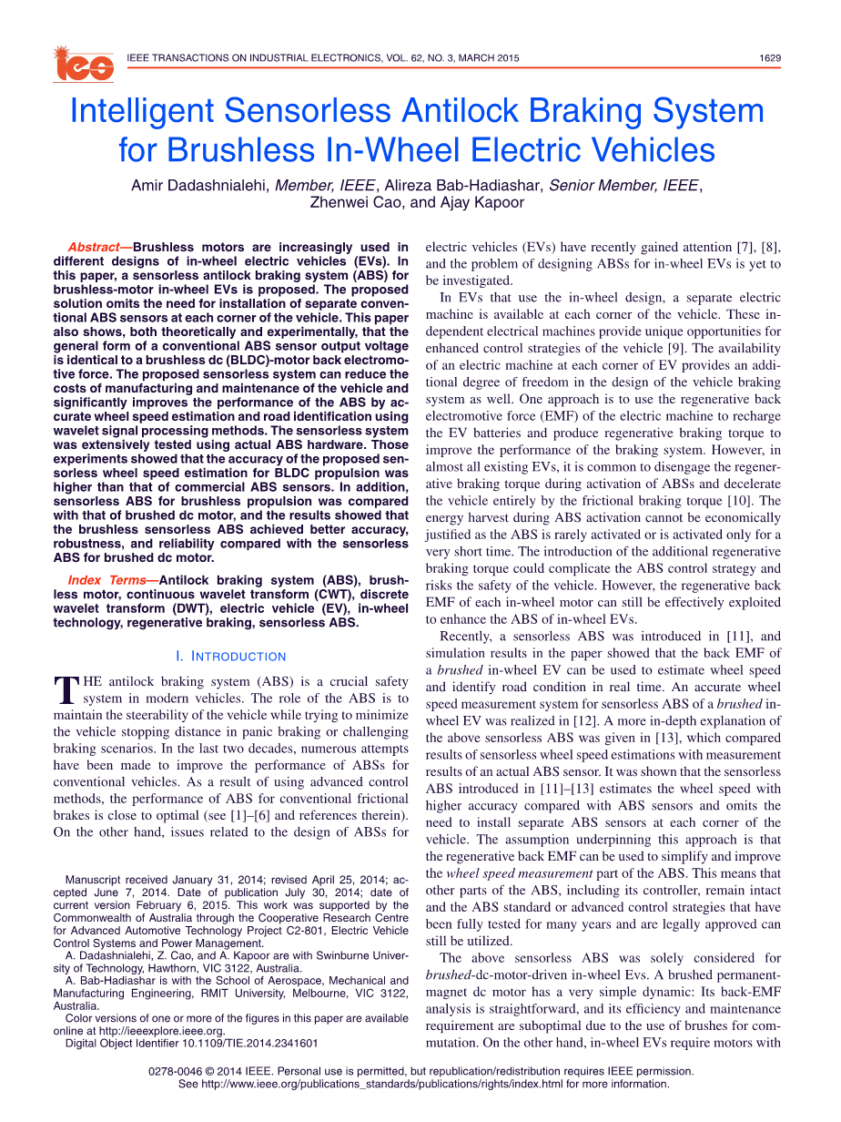 关键词:防抱死制动系统(ABS),无刷电机,连续小波变换(CWT),离散小波变换(DWT),电动汽车(EV),轮内技术,再生制动,无传感器ABS。