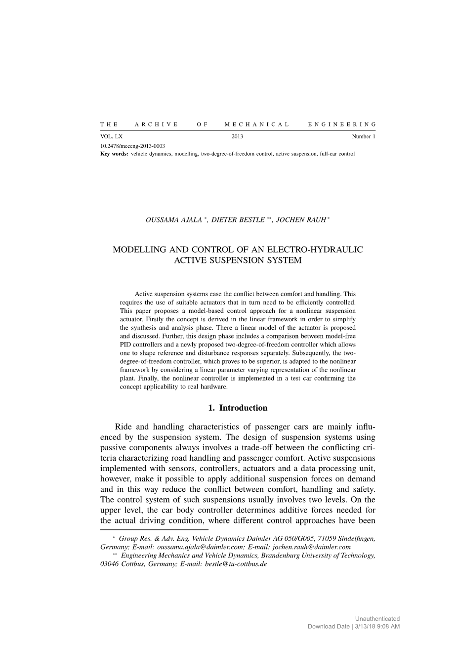 悬架系统极大的影响力乘用车的行驶和操控特性,悬架系统的设计是被动元件的设计,它涉及到道路处理和乘客舒适性的相互冲突的标准。而主动悬架安装了执行器,控制器,传感器以及信息处理单元,通过对悬架系统施加额外力,可调节舒适性,安全性,以及操纵性之间的冲突,而此类悬架的控制系统则可分为两个等级,高级别的汽车控制器在确定施加力在悬架系统是需要实时的汽车行驶状况,从最简单的天棚控制器到更复杂的最优控制器设计方法也在研究中,在较低级别上,执行器控制器必须保证执行器达到由车身控制器提供的所需参考力。大多数关于主动悬架系统的研究将执行器视为理想的力源,并忽略其内部动力学,该动力学以多种方式与车辆动力学的其余部分相互作用,事实上,大多数执行器表现出非线性行为[7],具有有限的带宽[8],并且暴露于外部干扰,这使得控制器设计更加复杂并且对控制器设计过程提出了额外的要求。 而且,主动悬架的实现通常只是理论研究的焦点,与实际实施几乎没有关系。