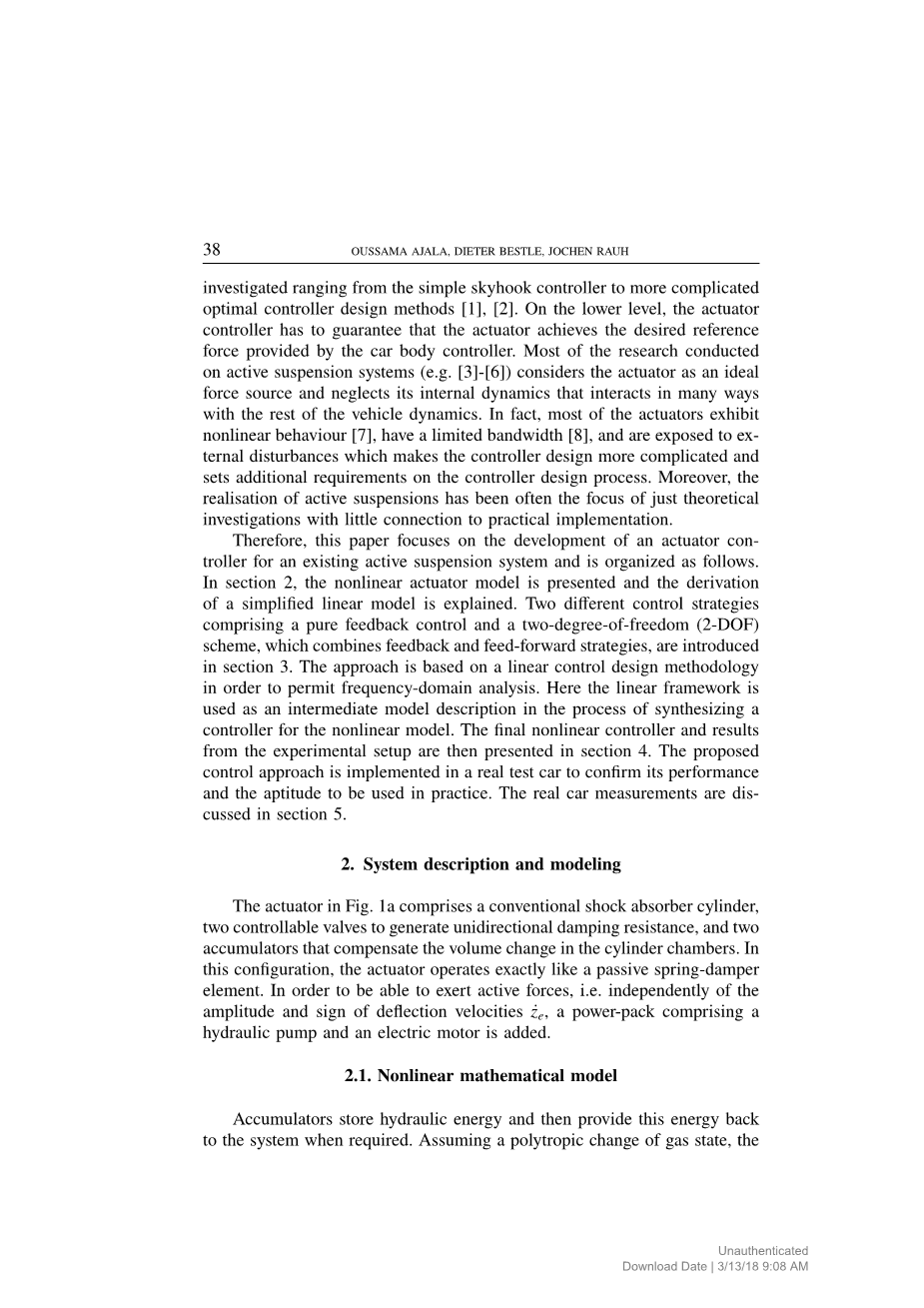 因此,本文重点介绍现有主动悬架系统的执行器控制器的开发,其组织如下:在第2节中,介绍了非线性致动器模型,并解释了简化线性模型的推导。 介绍了两种不同的控制策略,包括纯反馈控制和结合反馈和前馈策略的双自由度(2-DOF)方案。第3节。该方法基于线性控制设计方法,以便进行频域分析。这里线性框架被用作合成非线性模型控制器的过程中的中间模型描述。最后的非线性控制器和实验装置的结果将在第4节中介绍。所提出的控制方法是在一辆真正的测试车上实施的,以确认其性能和实际应用的能力。 第5部分讨论了真实的汽车测量。
